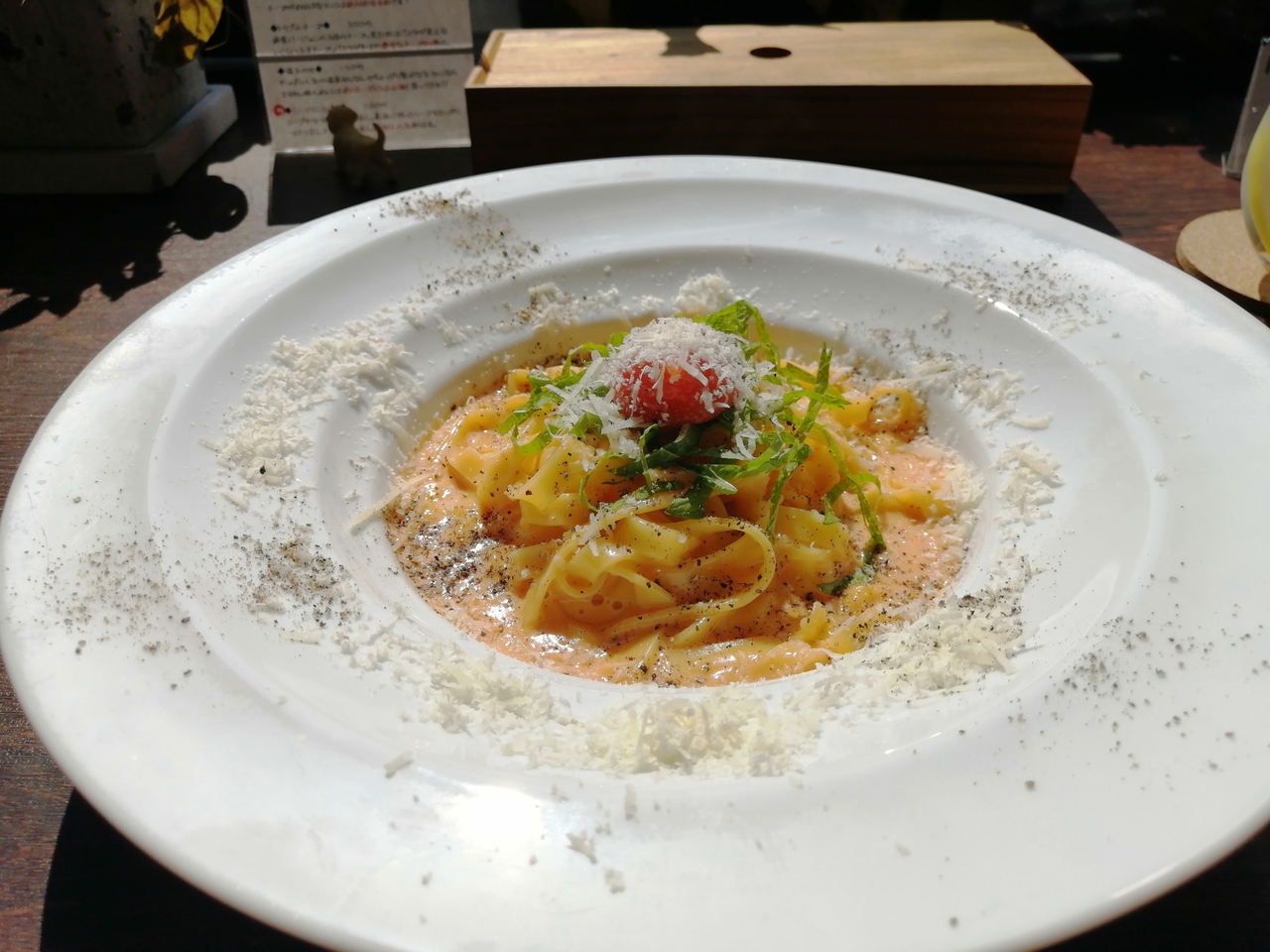 一ヶ月ぶりくらいにランチタイムに訪れました。初めて明太カルボナーラを食べましたが、濃厚ながら青葉が効いていて美味しかったです。ソースがもったいなかったので、ソフトフランスパンを100円で追加して、付けて食べました。サラダも美味しいです。