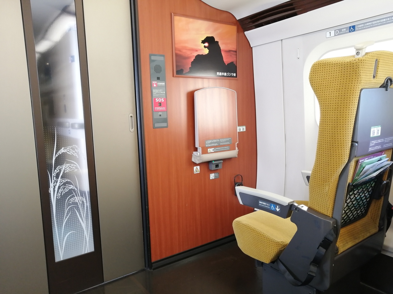 秋田駅から田沢湖方面へ行く際に、数回新幹線こまちに乗りました。各主要駅でこまちの模型が展示されていました。コロナの影響か乗客は多くありませんでしたが、シートは稲穂を思い起こさせる黄色で、扉のガラス部分には稲穂が描かれていました。