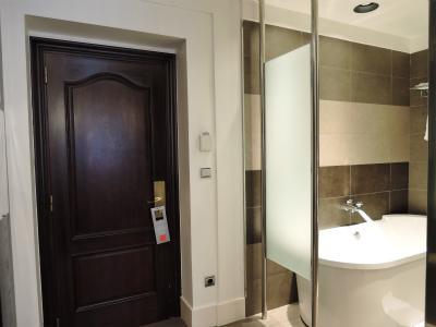 バスターミナルからタクシーで10ユーロ以内でした。ホテル前には常時タクシーがいますので、早朝のフライトでも予約不要でした。スパークリングワインもある朝食は口コミ通り充実していて、1時間以上かけて満喫しました。たまたまなのか、私達の部屋はバスタブが、玄関横に仕切りだけで剥き出しに配置されていたり、ホテルの外観とは異なるデザイン性たっぷりな感じでした(笑)