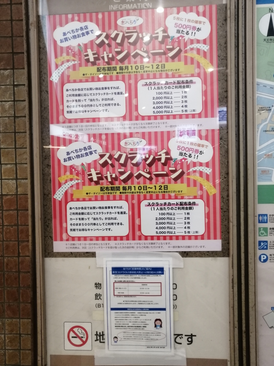 地下鉄谷町線を通勤で利用しているので、あべちかさんにはしょっちゅうお世話になっています。今日は宝くじを購入しました。100円均一ショップのDAISOや飲食店、携帯電話の会社がいくつか入っていて、そこそこ便利です。