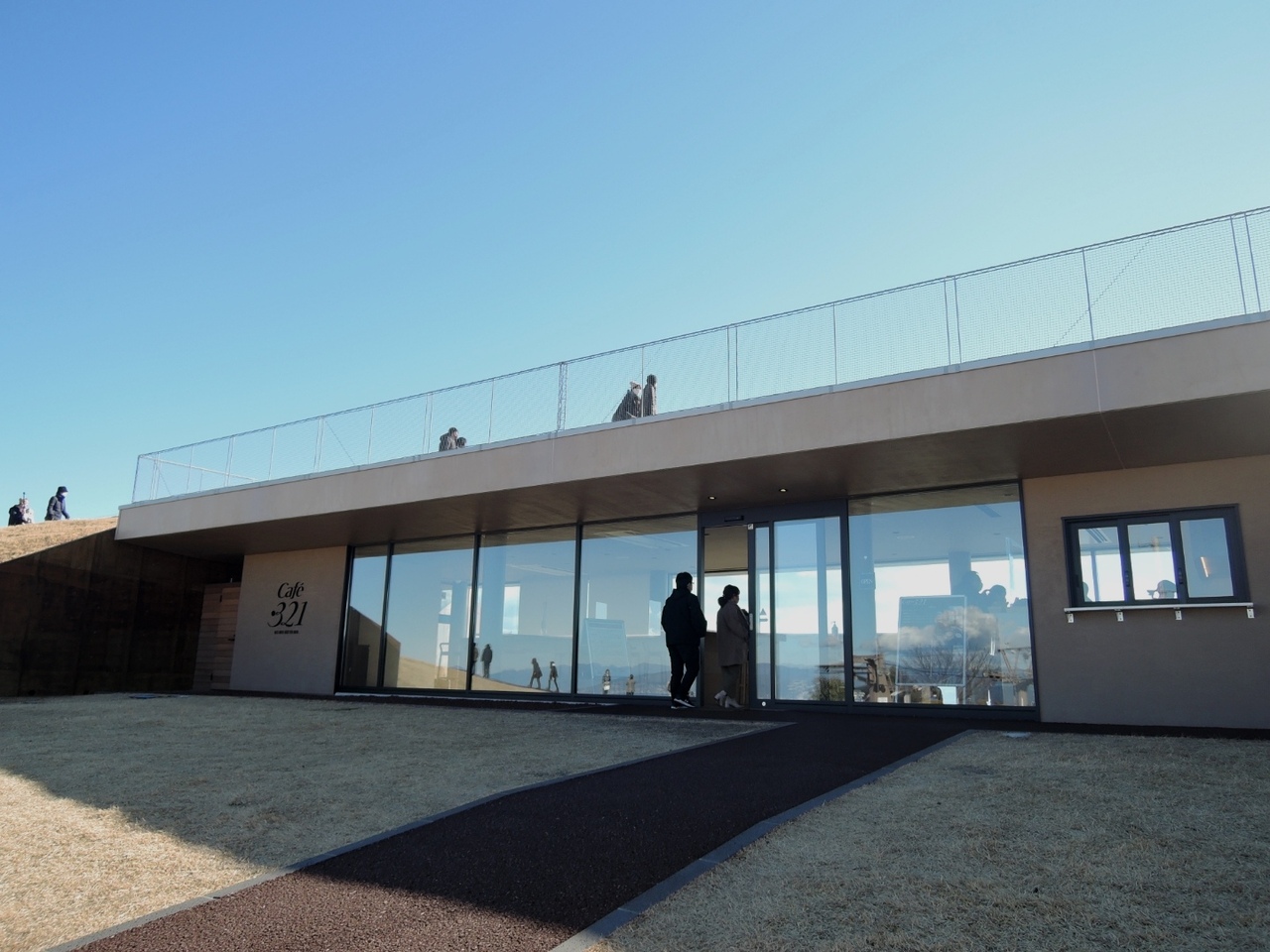 伊東温泉に宿泊した際に、いいお天気だったので伊東駅から小室山にバスで向かいました。リフトで上に上がったところにあります。ガラス張りでオシャレです。時期によっては寒いので、暖を取ったり、のんびり景色を見ながらゆっくりしたりできます。