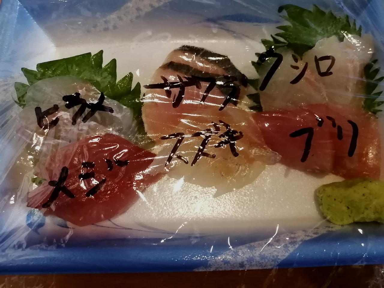 口コミを見て、一人前千円からお刺身を作ってくれると知り、訪れてみました。お店には電話番号も貼ってあり、お刺身のオーダーも積極的に受けているようで、心配することなく電話で注文できました。食べるときに嬉しかったのが、ラップの上にそれぞれのお魚の名前を書いてくれていたことです。保冷パックを持参していたのですが、氷も少し頂けたので宿でゆっくり食べることが出来ました。