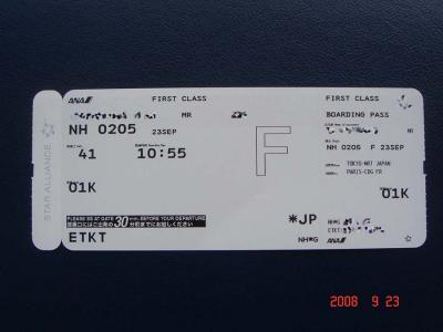 NH205(成田→パリ)ファーストクラス搭乗券。 ANAのファースト...