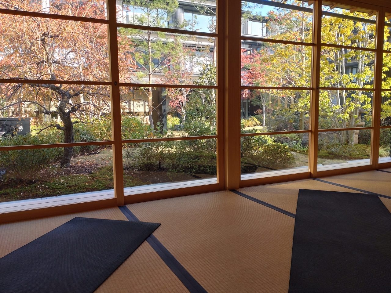 朝は無料で和室でお庭を眺めながらウエルネス呼吸法のエクササイズが受けられます(要予約)
