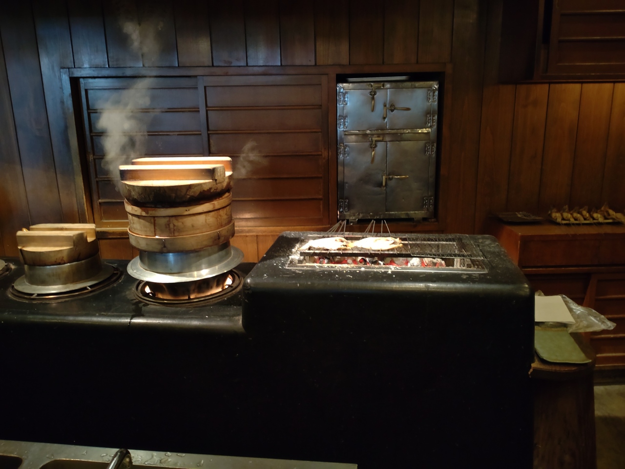 食事はカウンター越しに炭火で焼かれた料理屋羽釜で炊き上げられたご飯が熱々で食べられるのが魅力だと思います。- 旅行時期
