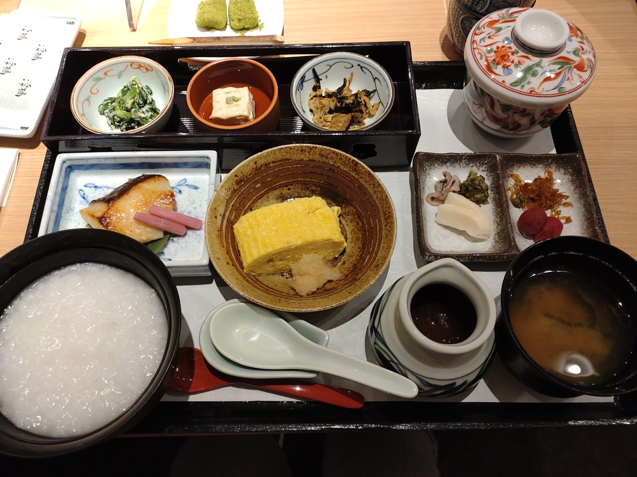 朝食は日本庭園を眺めながらいただけます。丸いお重箱に彩り豊かな小鉢が並んでました。