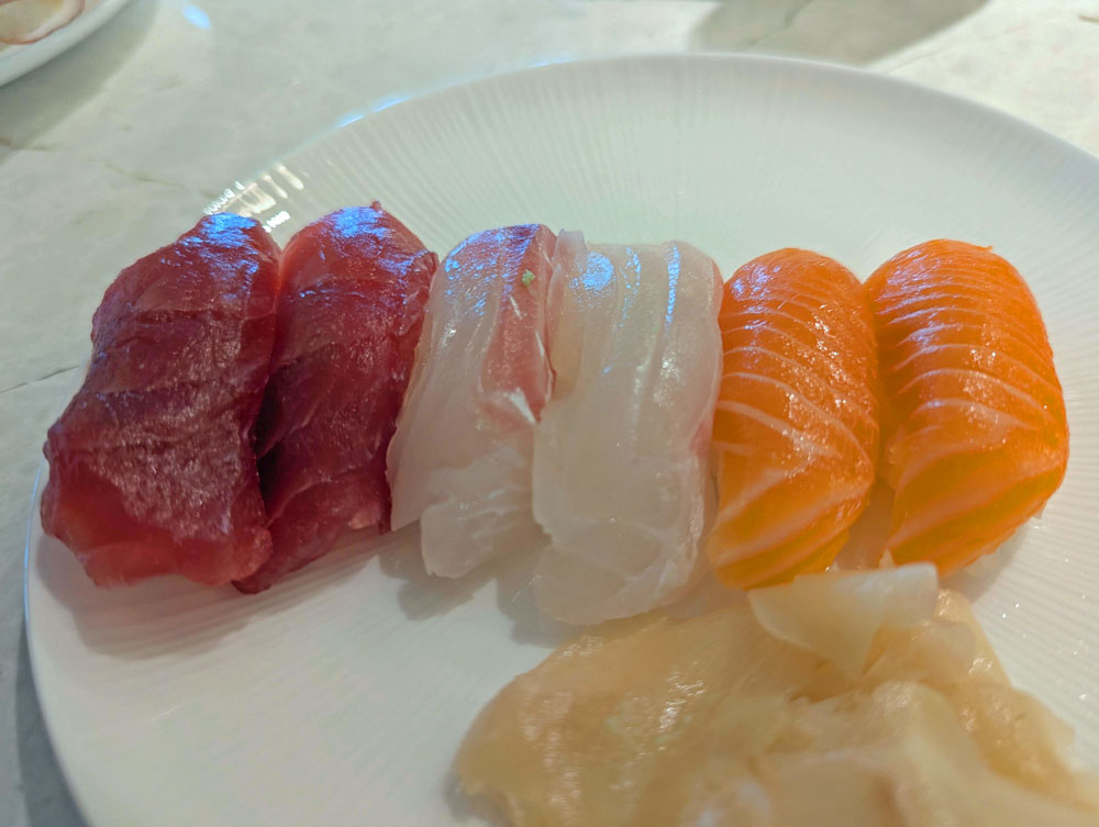 前菜はどれも美味しいです。特にスモークサーモン、カプレーゼ、カルパッチョ。あと、職人さんがにぎるお寿司、鴨味噌担々麺、ローストビーフなど