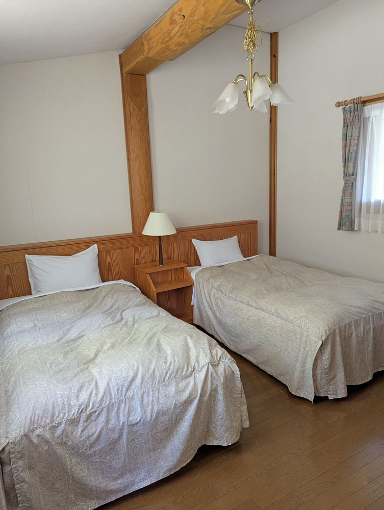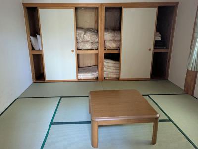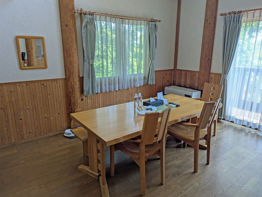 連棟タイプは3階建てで、1階がお風呂(蛇口から温泉)、2階がリビング、キッチン、和室、3階がベッドルームになっていました。昼間はまだ暑くてエアコンが必要でしたが、夜は締め切っていても涼しかったです