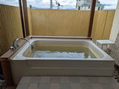 部屋の露天風呂は、源泉かけ流しで利用できました。見た目は普通の湯船で色気はありませんが(笑)、ほんのり硫黄の香りがする単純泉で最高でした。つるっつる♪