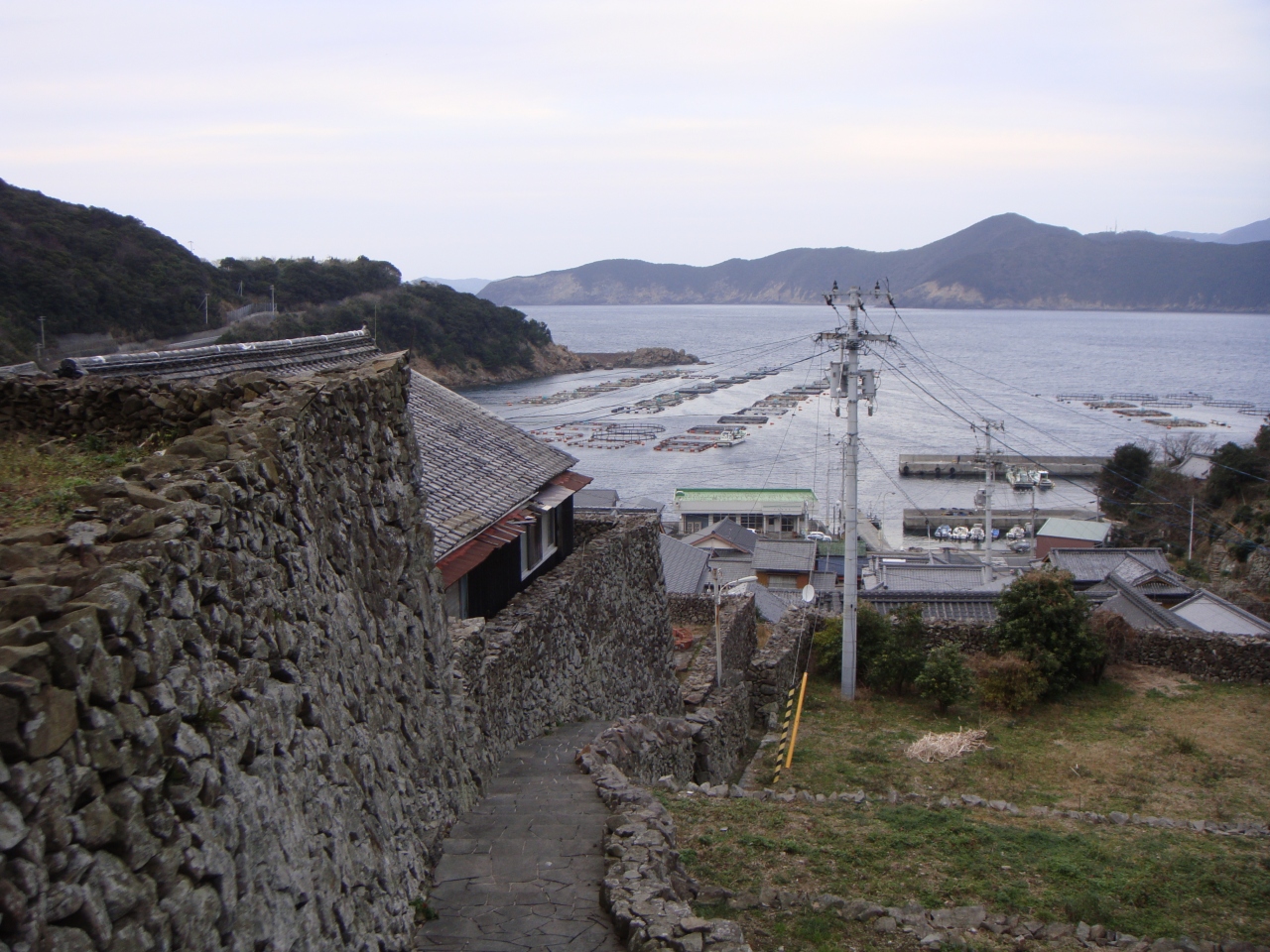 入江に面した急斜面には民家が山の中腹まで続き、それぞれの民家は、台風や季節風から家や暮らしを守るため、軒に達するほどの石垣が整然と積み上げられています。