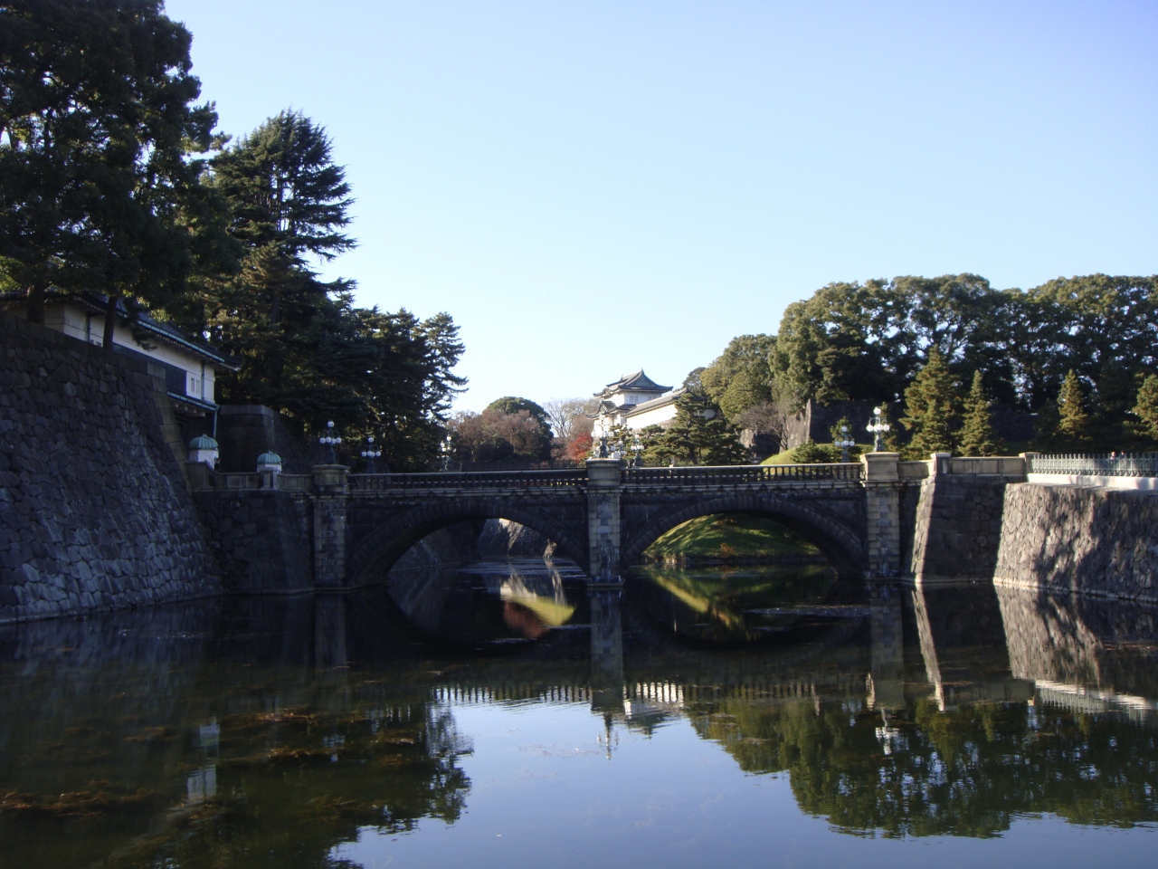 二重橋は、東京都千代田区千代田の皇居内にある橋の通称である。皇居正門から宮殿へ向かう途上、二重橋濠に架かる鉄橋で、本来の名称は正門鉄橋である。