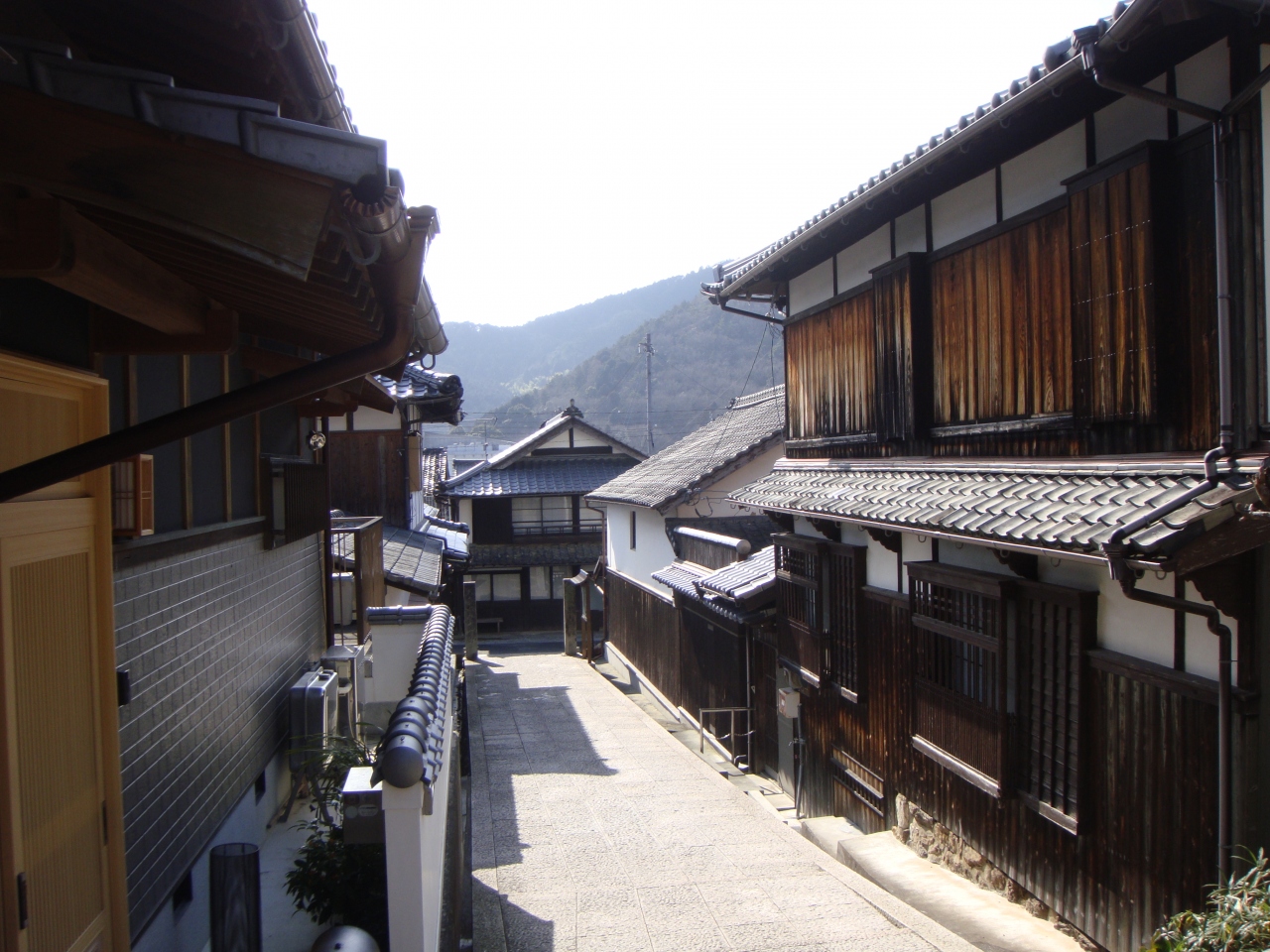 八日市護国の町並みの特徴は、浅黄色と白漆喰で塗りごめられた重厚な外壁があり、棟を街路と平行に通す平入造りで、街路に面した壁面が通っています。隣家との間には、道路や水路空間を残し、この路地空間は、他所では見られない造形美を醸し出しています。