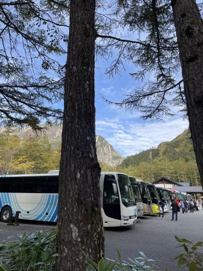 ここの駐車場に入る前から渋滞で、ドライバーさんと添乗員さんの判断で、途中の道路で降ろしてもらいみんなで歩いて河童橋方面へ向かいました。観光バスがたくさん並んでいたし、駐車場のどこに止めたかわからないので、集合は時間早めに戻りました。バスも停めた時に出る時間を指定して、その時間に絶対出ないといけないので、遅れたら自力で帰ってくださいと言われました。