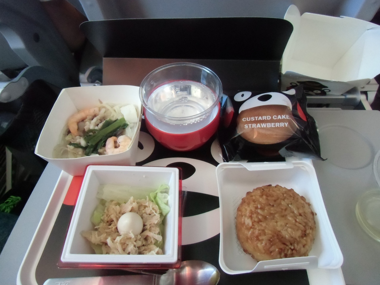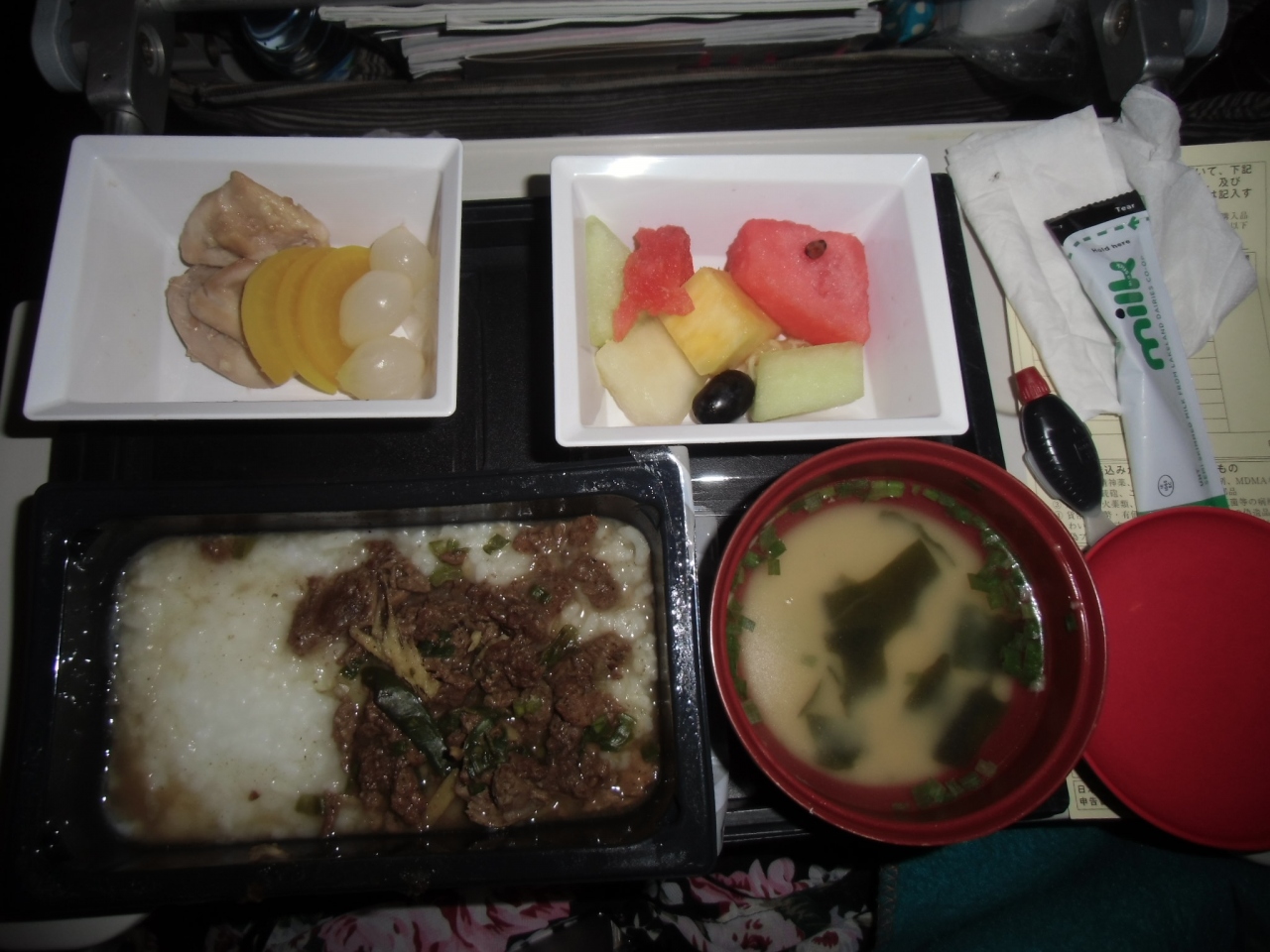 料理ですが、行は日本で作っていますからそこそこいただけます。しかし、帰りのひどいこと、牛筋みたいな硬いお肉がのったおかゆ。オレンジ色したへんなパンみたいなもの。私たちの席は、前からくるサービスと後ろからくるサービスのちょうど中間地点だったようで、食べたいメニューは毎回品切れ。おまけに、夕食では、食後のお茶のサービスを忘れられてクレームしたのに、朝食時にはジュースのサービスを忘れられてしまいました。クレーマー対策ゼロ!