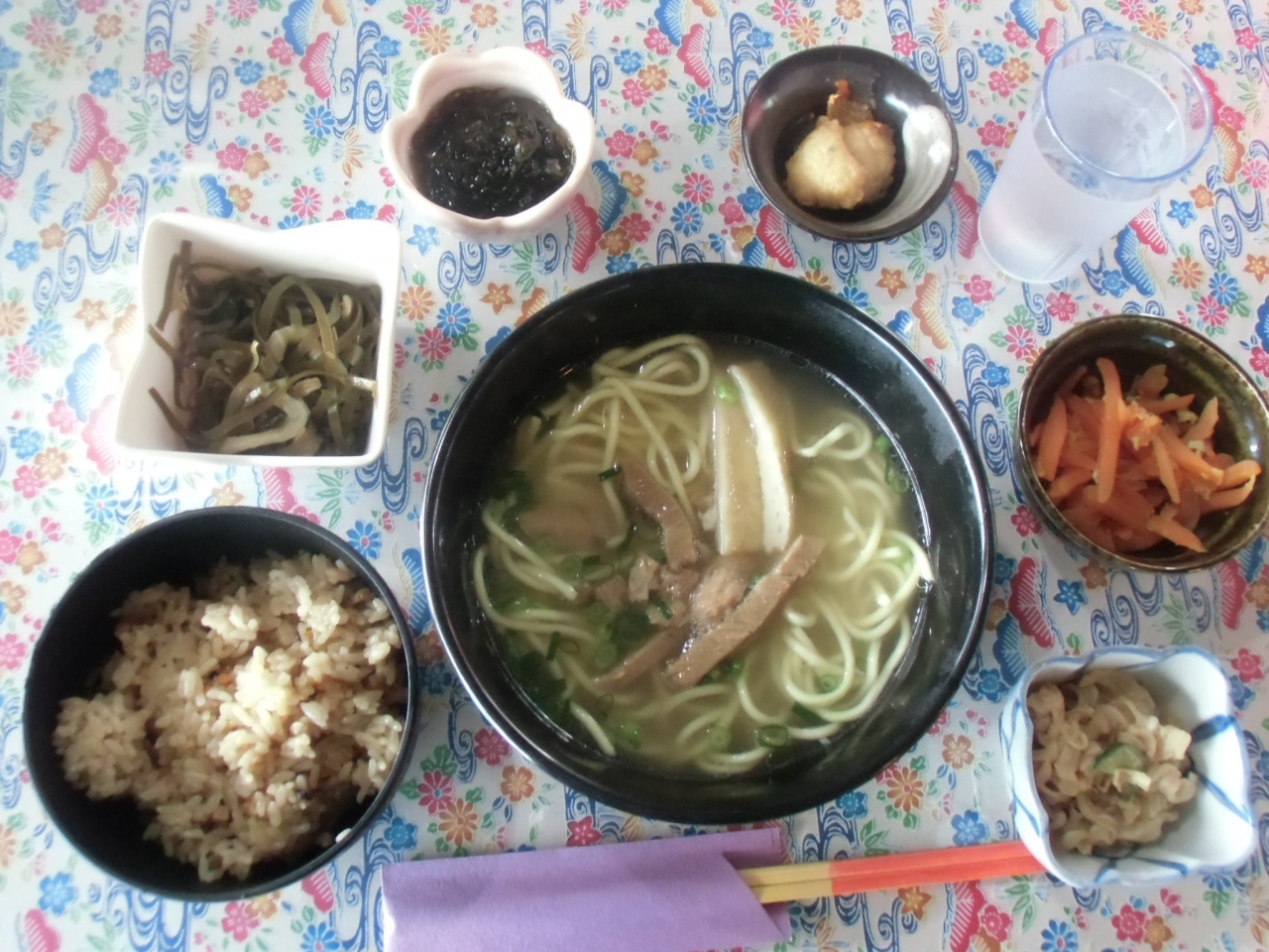八重山そばは2本の蒲鉾と2枚のチャーシューのトッピングで少し寂しいですが。まあおいしかったです。ただ、500円かけて付け加えた小鉢とジューシー(炊き込みごはん)は割高だったように感じました。八重山に来たら、一度は食べたいですが、もう少し印象に残るお味だとうれしいのですが、残念ながらもう一度食べたいとは思いません。