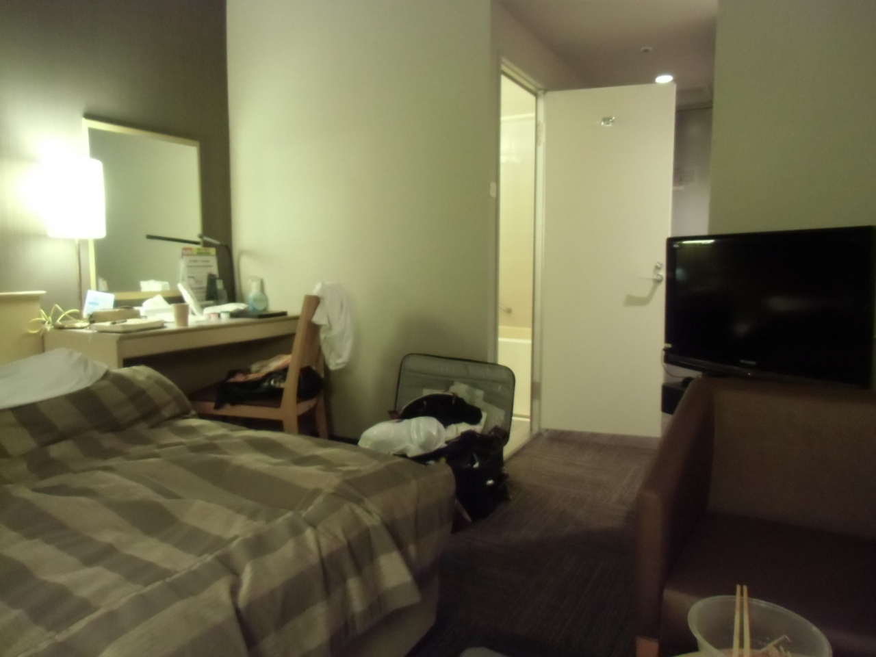 このホテルを選んだ最大の理由は、大浴場完備。一日中観光をして疲れた体を癒すにはなんといっても大風呂に限ります。さらに、朝食無料サービスもうれしい。普通のビジネスホテルのサービス朝食に比べて、品数が多いと思います。1,2泊なら問題なしです。夕食は、お風呂に入ったあとお部屋でのんびり飲むのが私流なので、近くにイオンがあるのがうれしかったです。お惣菜もたくさんあるので、2泊とも、お風呂の前に買出しに行き、刺身・サラダ・そら豆・から揚げ・冷やし麺そしてBeerなどを買い込んでお部屋でのんびり飲みました。