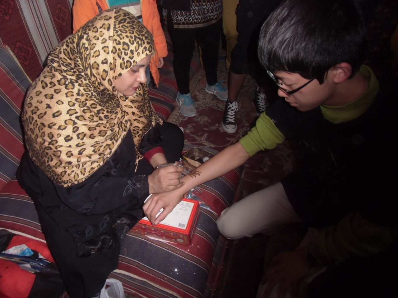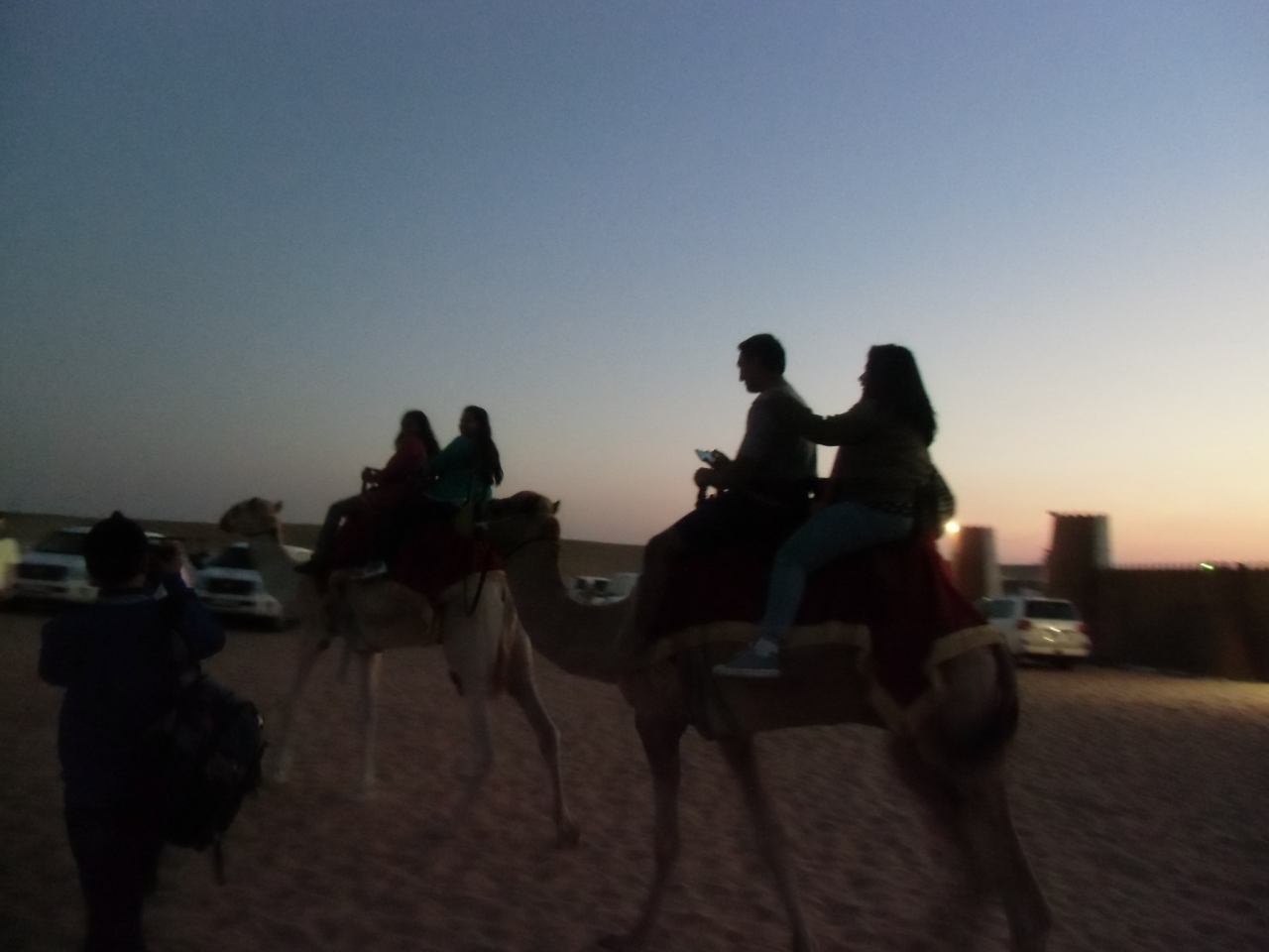 スリリングなドライブを終えると、公道の向こう側の夕食会場へ。たくさんの4WDがどこからともなく集まってきて、かなりのお客さんでした。ラクダに乗るのも、ヘナペインティングも、夕食をもらうのも、トイレも、何をするにも長蛇の列に並びます。 ラクダライドは、時間がたつにつれ、コースが短くなり、日も暮れると写真もとれません。これから行く方は、まず、ラクダライドで記念写真を撮ることをお勧めします。 別料金を出して、豪華なヘナペインチングをしてもらった人たちは、乾くまで手が動かせず、結果、夕食もろくに食べることができませんでした。バーべキューデイナーをあきらめて、記念のヘナに時間とお金をかけるのは、究極の選択です。