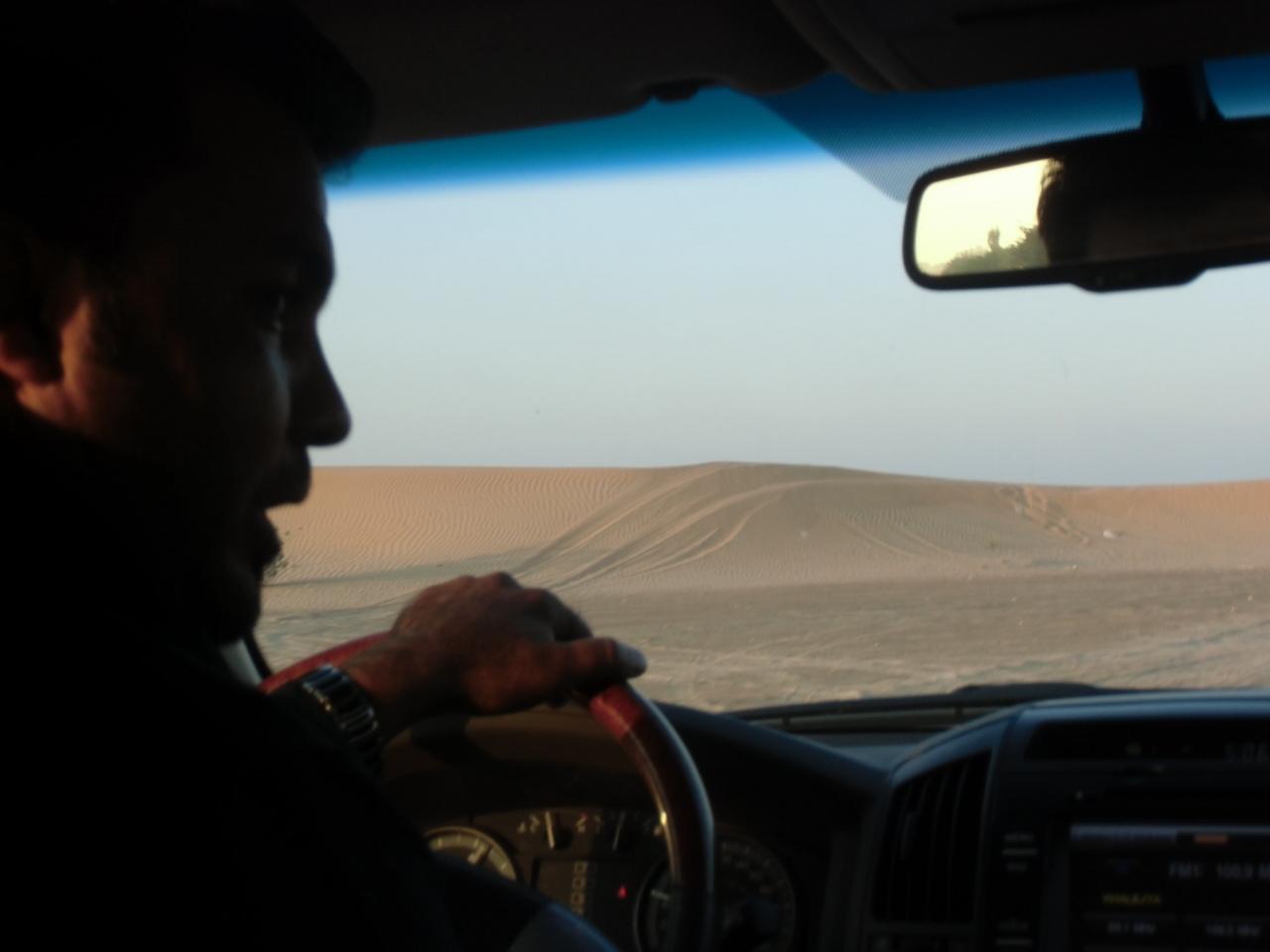 4WDでの砂漠ドライブ。話には聞いていましたが、すごい迫力でした。車が横転するのではないかとドキドキしました。ドライバーさんにも、上手下手があるはずで、先頭を行くドライバーさんはベテランなのでしょうけど、後続は??? どなたか、「横転した」って口コミないかしら??? とりあえず、我々の車は、無事に進みました。途中、砂漠の真ん中で車を降りて、サンセットを鑑賞。これは、車のエンジンを冷ますためでもあるのでしょうか?ボンネットを開けて小休止でした。この時、花粉症の方は、マスクが必要です。細かい砂は、辛いです。