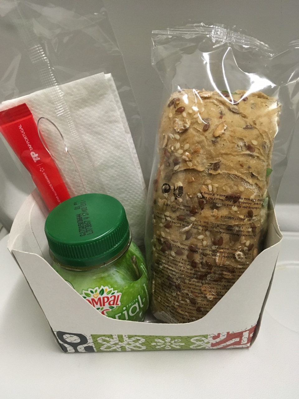 機内食には小さなサンドイッチ、グミ、フルーツジュースがつきました。ドリンクサービス(ソフトドリンク、アルコール+コーヒー、紅茶がもらえた)があるのだからフルーツジュースは他のものにしてほしいと思いました。