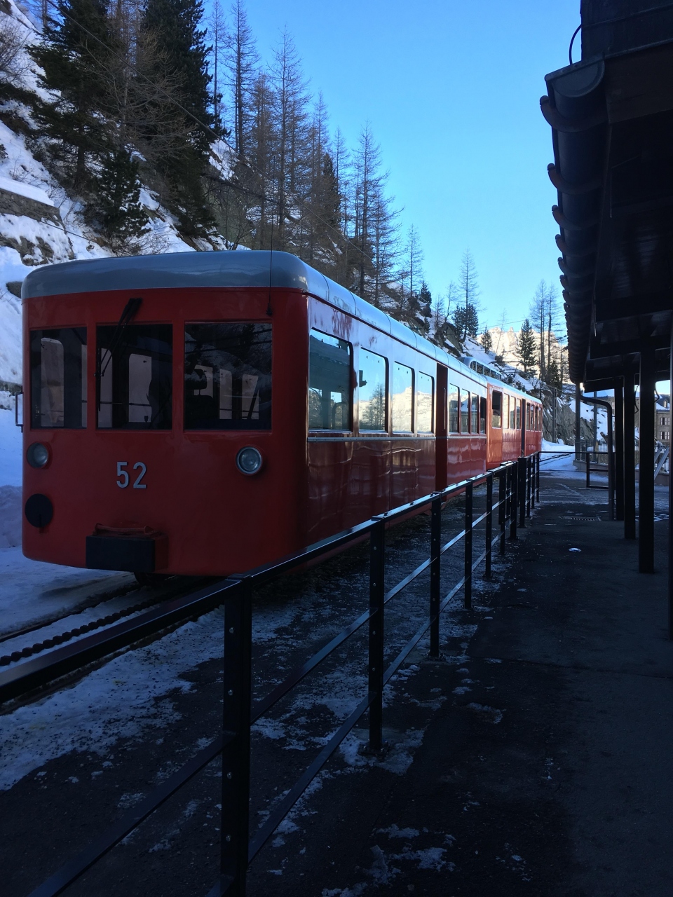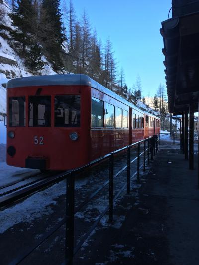 赤い列車でMer de Glaceを目指します。左側の席からはシャモニーの街が見渡せます。お正月も運行していました。午前は1時間おきの運行でしたが午後は20~30分おきになっていました。駅には無料で使えるトイレがありきれいでしたが元から便座がないタイプのトイレでした。シャモニーはこういったトイレが多かったです。