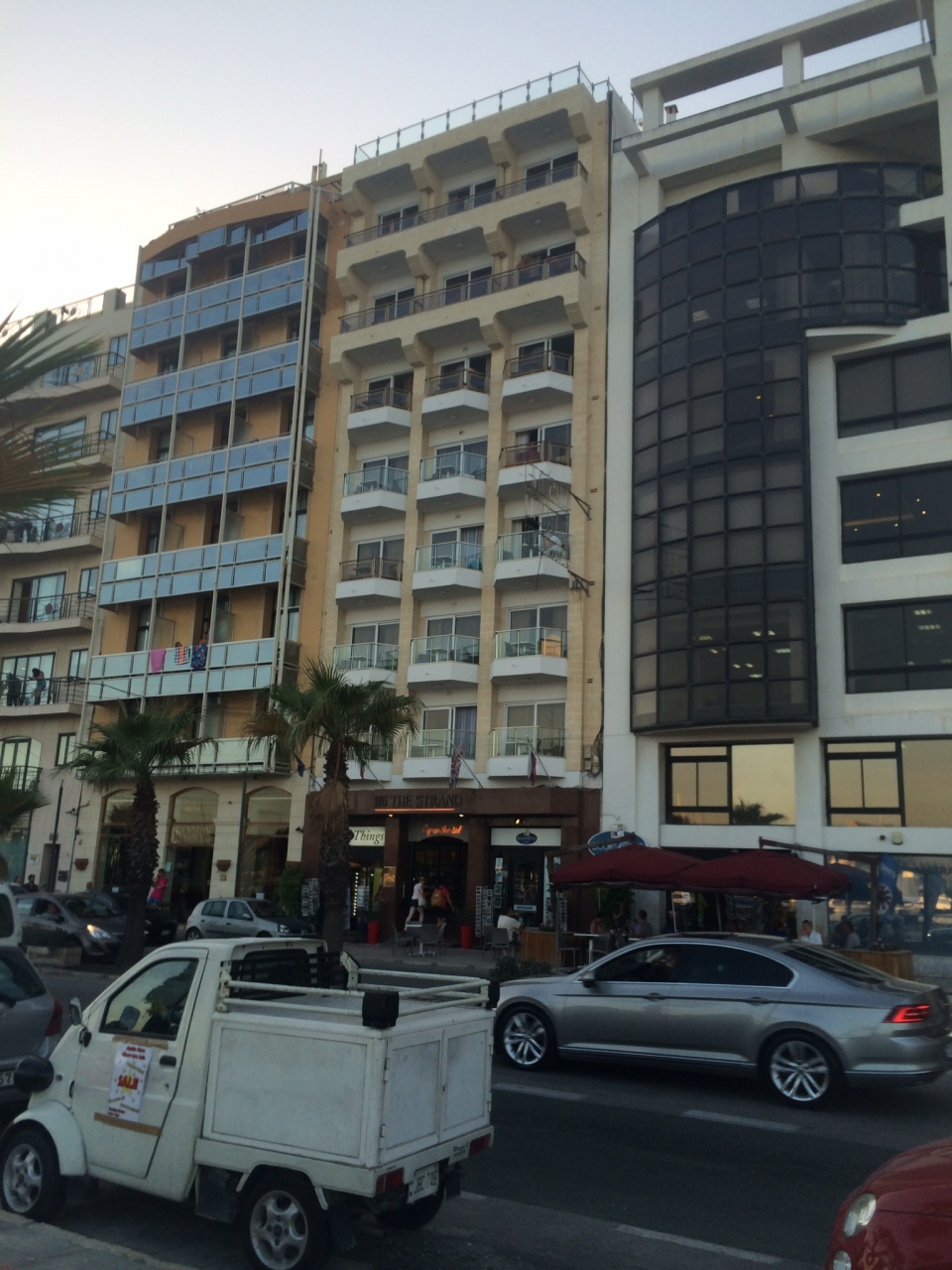 車のスピードは早い早い。マルタの人は運転が荒いとは聞いていたけど本当だった。2度急ブレーキ、1度クラクション。30分かからずSt.Julianのホテルに到着。