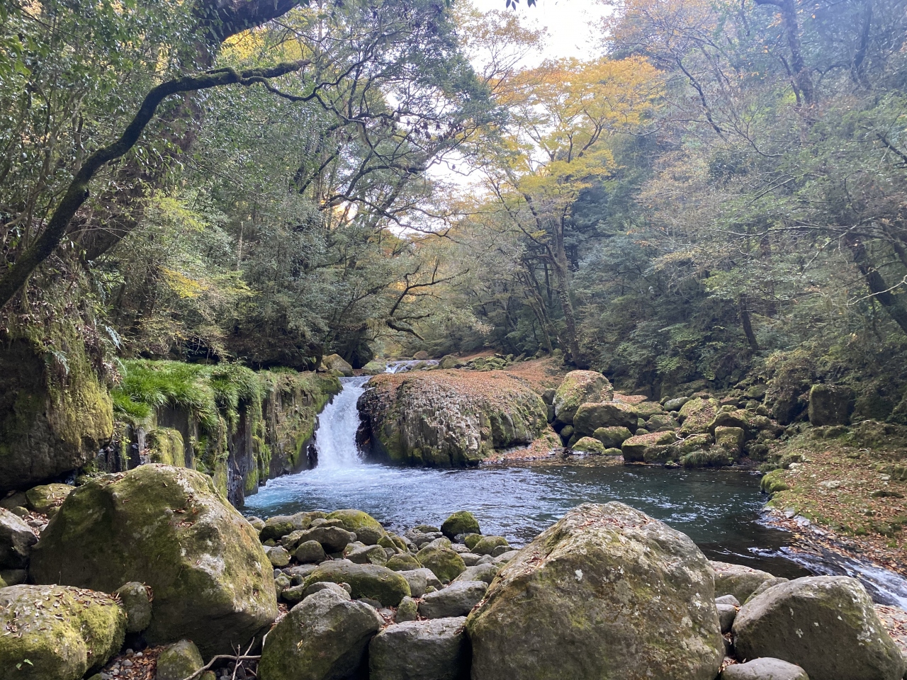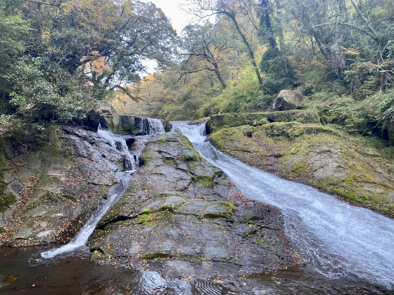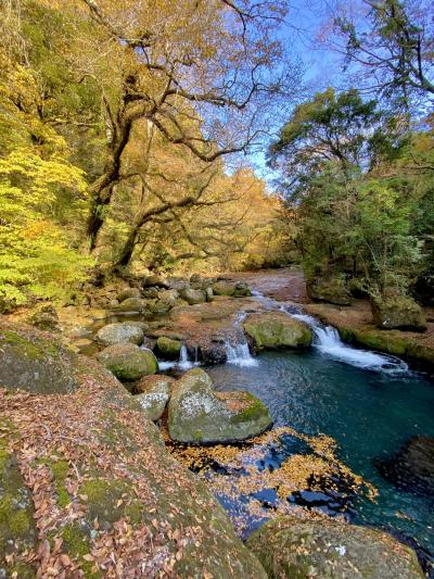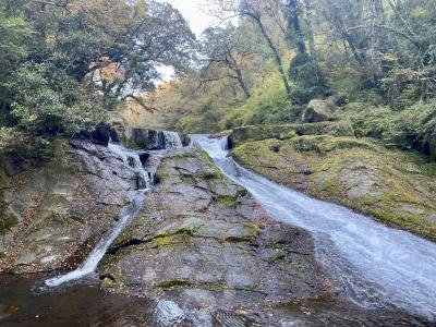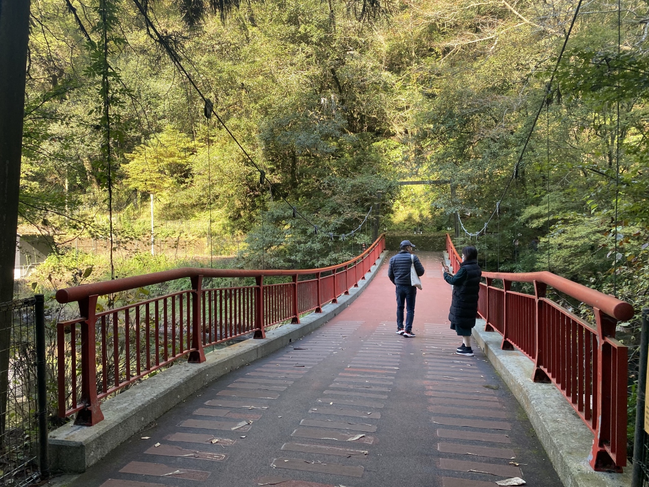 最初の橋を渡って遊歩道に入り、2つ目の橋を渡って折り返せば1Km 30分、3つ目の橋を渡って折り返せば2Km 1時間です。紅葉のピークは終わっていましたが、渓谷ぞいの素敵な風景が広がっていました。マイナスイオンというものは実際には存在しませんが、渓流なのでひんやりした空気は流れて涼しいです。