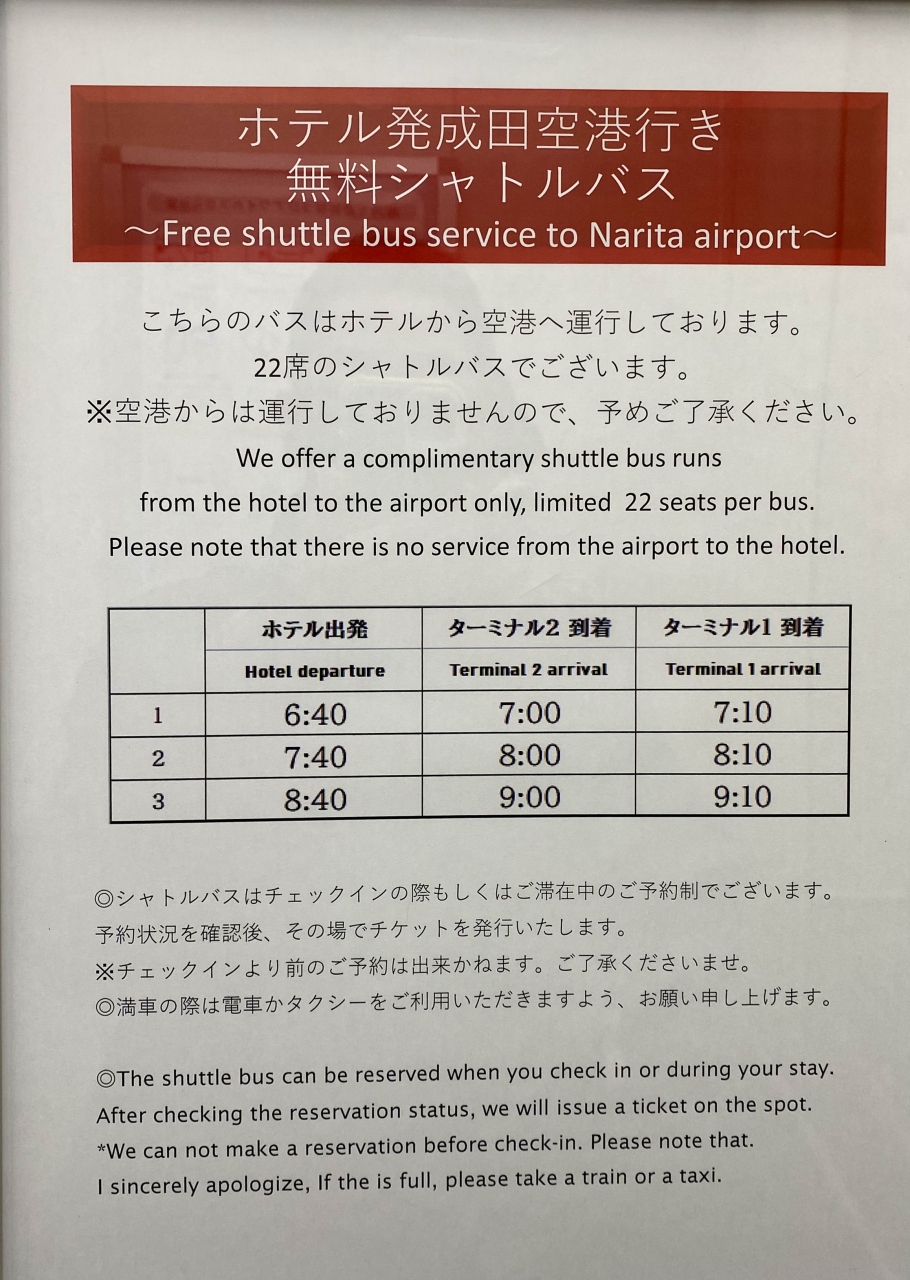 空港へのシャトルバスは無料で、チェックイン時に予約が必要です。ホテル発6:40、7:40、8:40のみで、空港からホテルへの運行はありません。