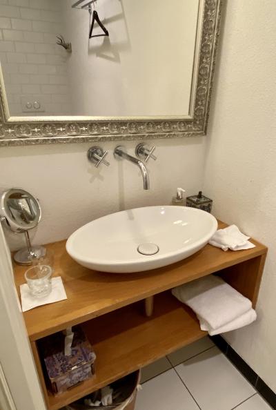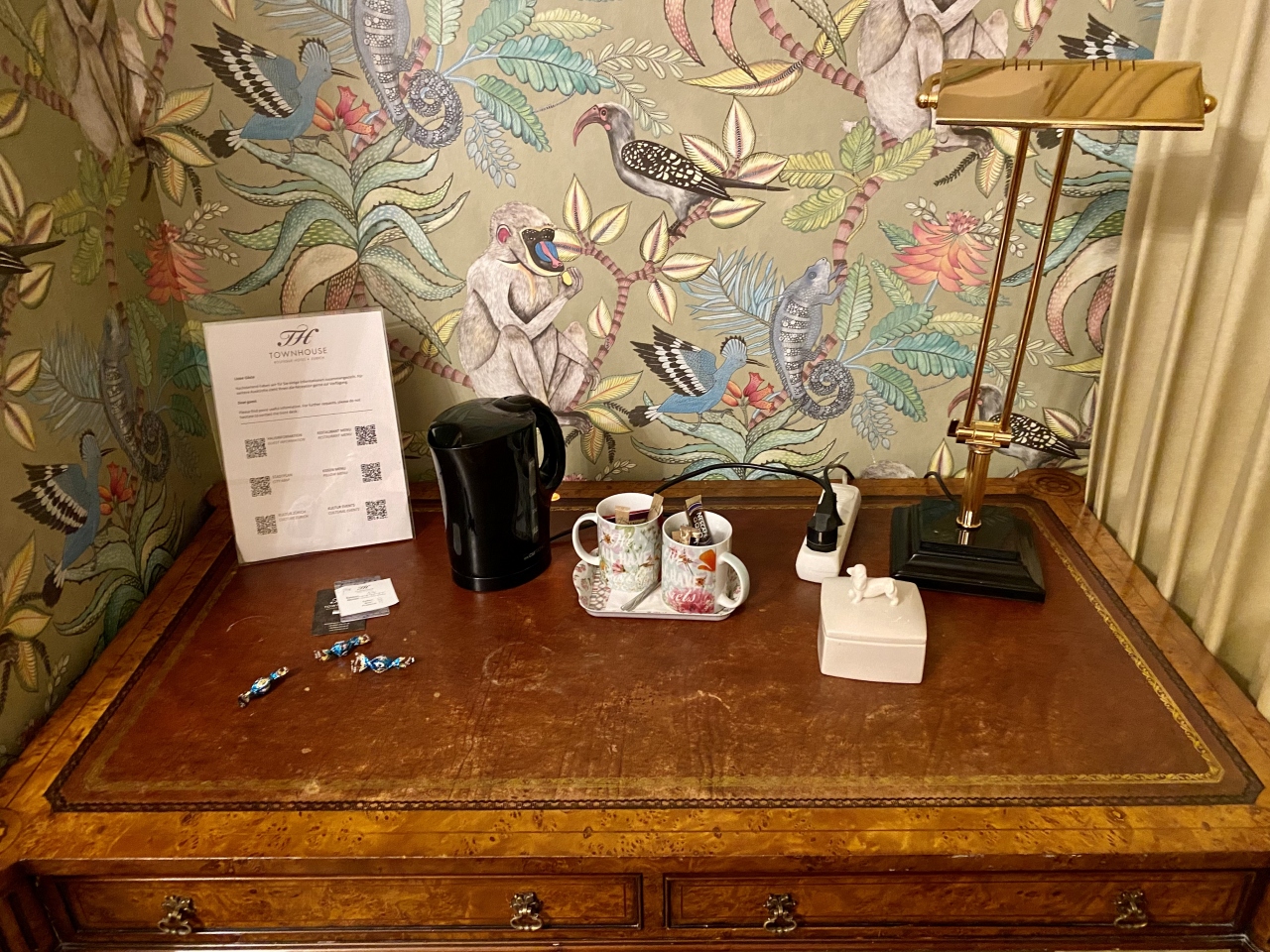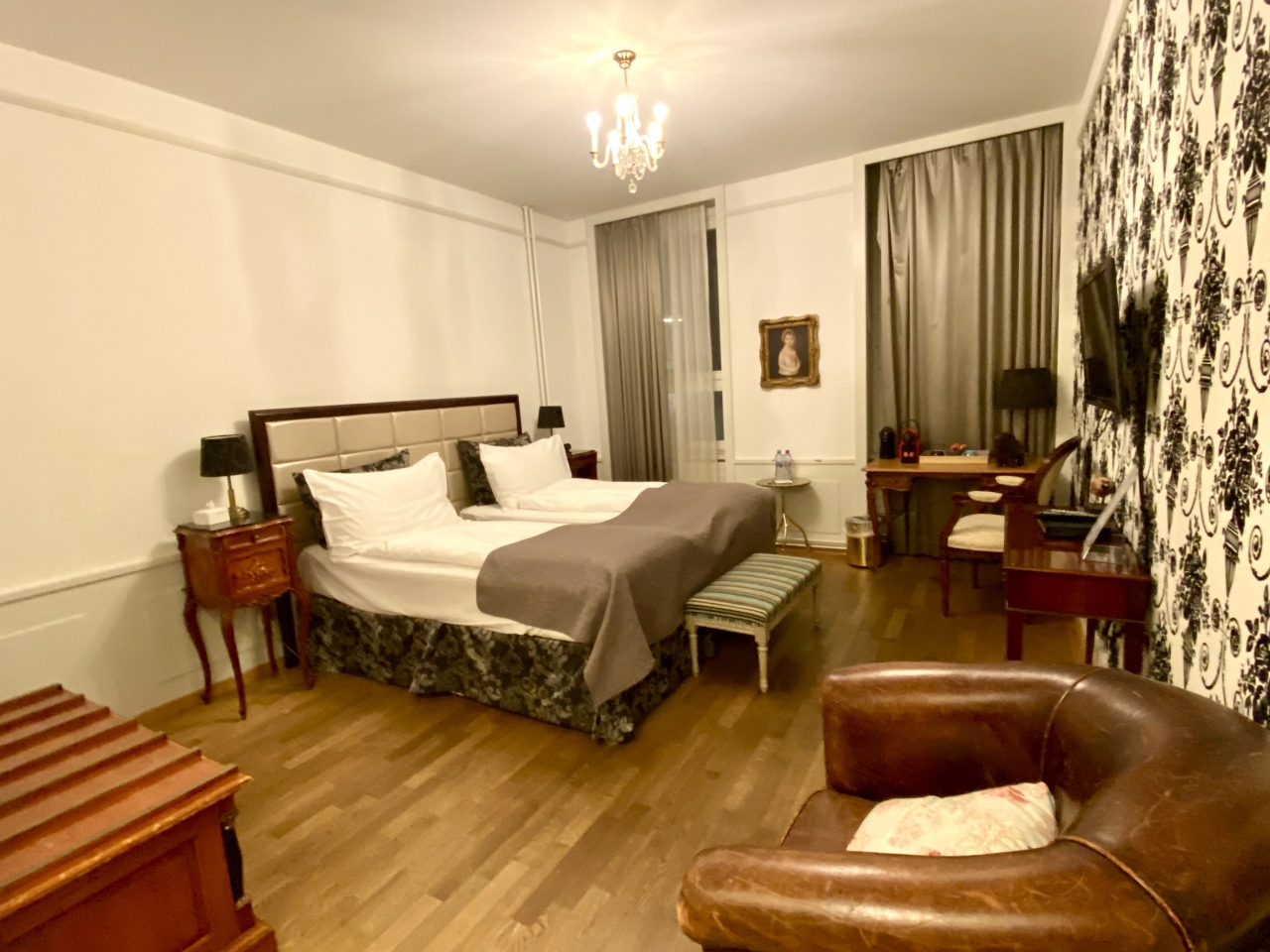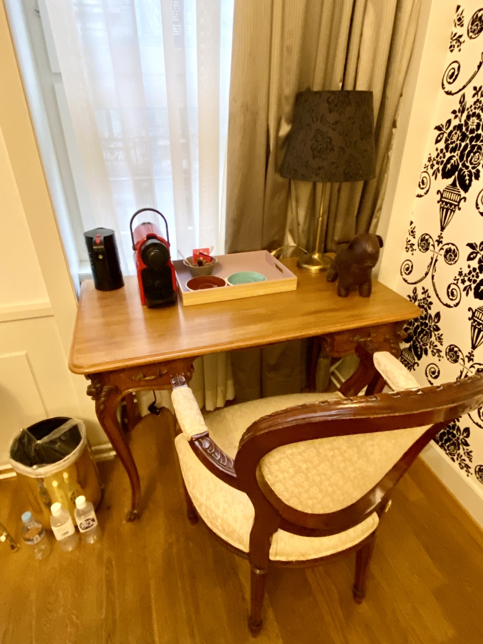 部屋はクラシカルな感じのブティックホテルです。今回はチェックインが遅かったため。バスタブのある部屋は空室がありませんでしたが、コーヒーマシーンがありました。セイフティボックスがあるので、持ち歩くものが減って助かりました。料金はコロナのせいか ? 2020年よりかなりお高くなっていました。