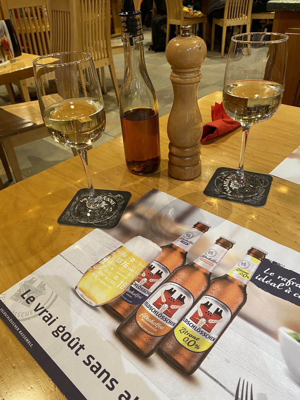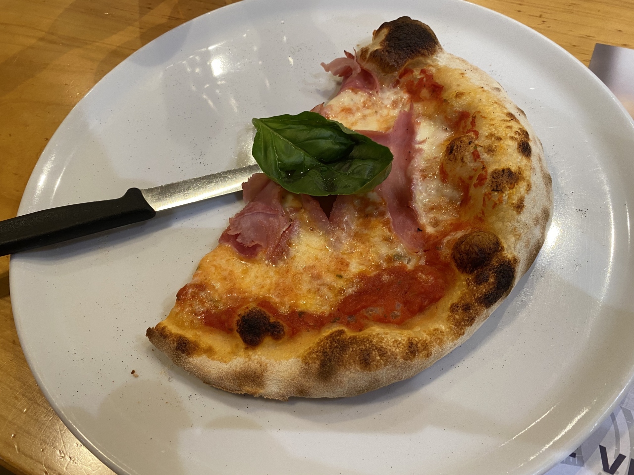 白ワイン(4.5CHF×2)、ミネストローネ(9CHF)、グリーンサラダ(7.9CHF)、ピザ(Mini : 21.5)、トータル47.5CHF=約7,125円。スイスの物価高と円安のダブルパンチ。日本なら安いコース料理とか食べられそうな料金ではあります。