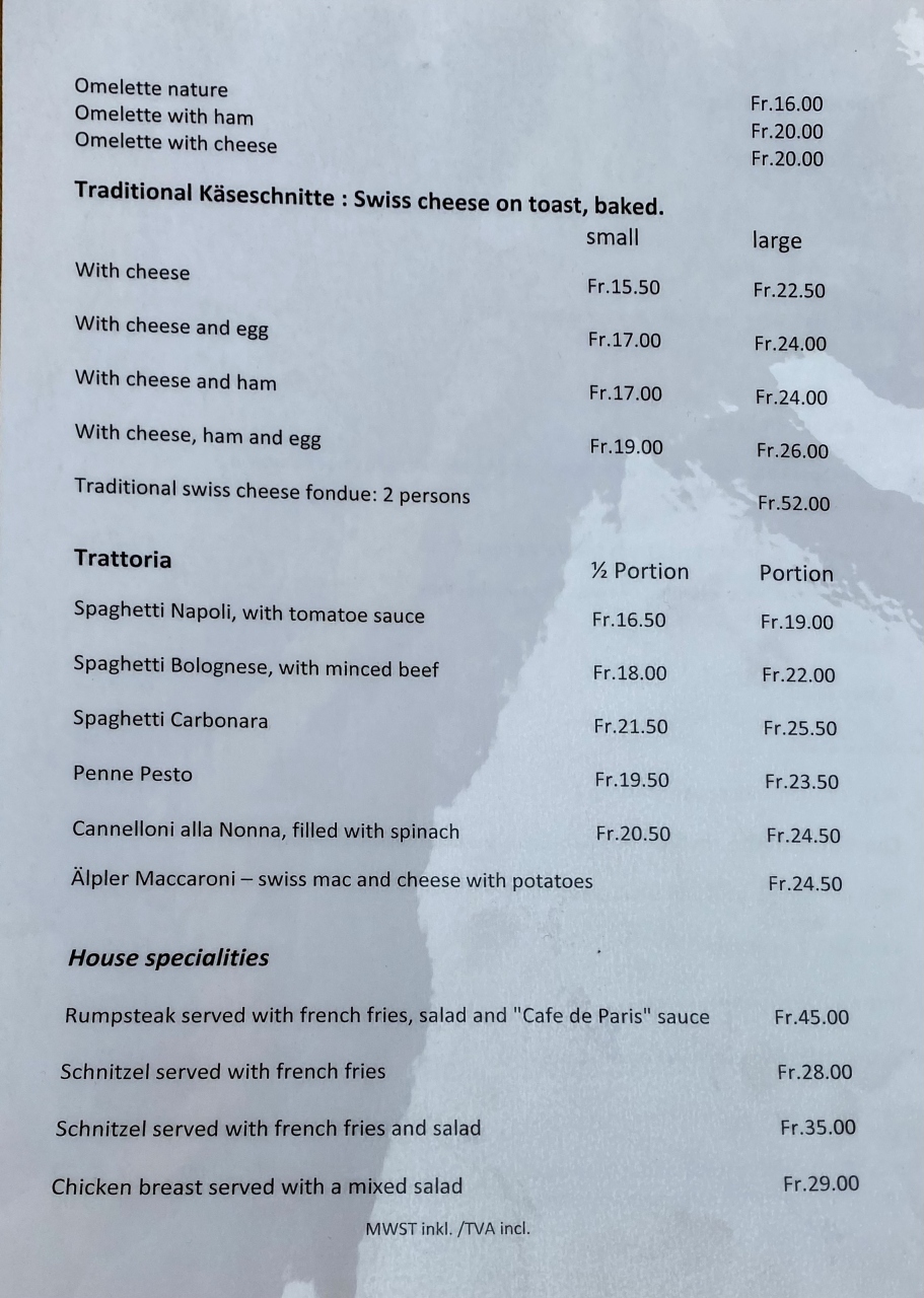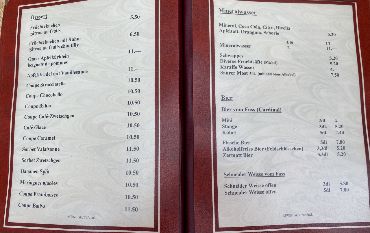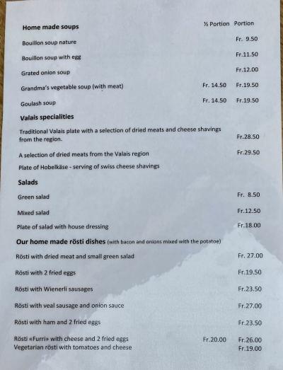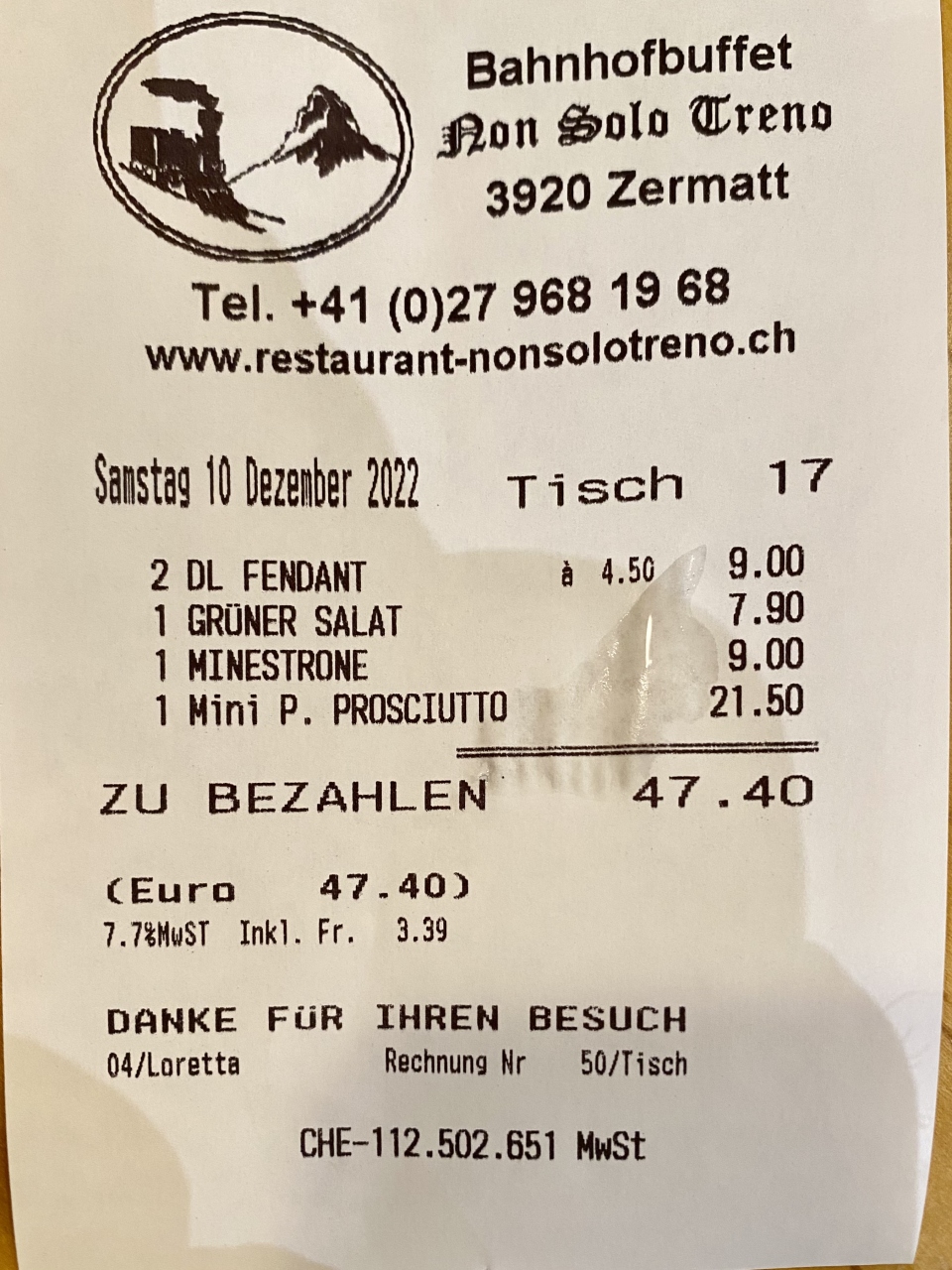 他にビール(2dl : 4CHF)、白ワイン(4.9)、ミネラル小(7)、トータル47.6CHF=約7,000円はツェルマットの平均的2人分ランチの費用かな。