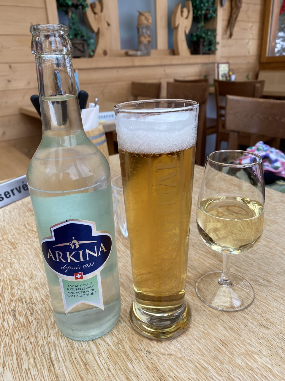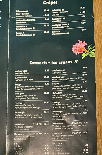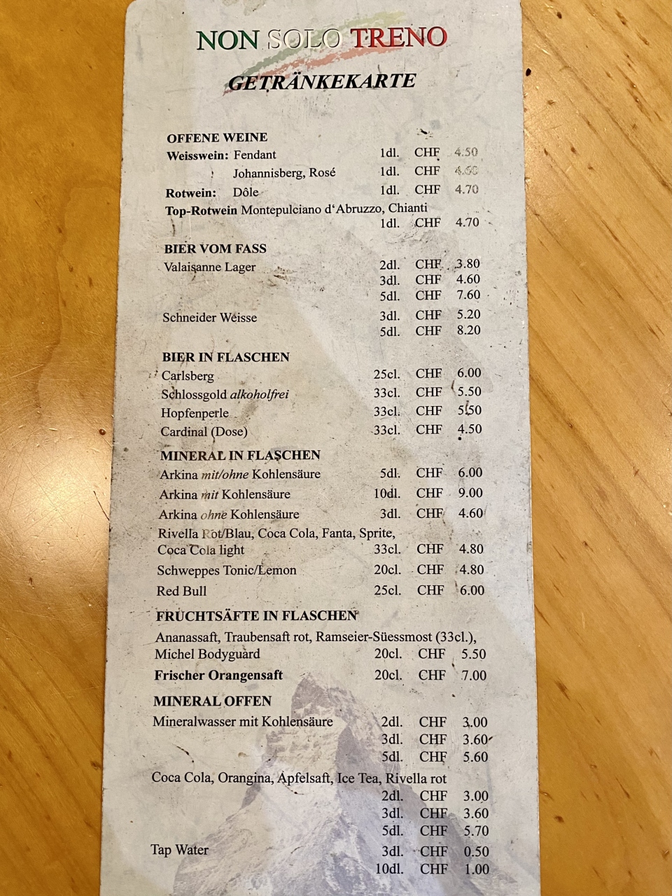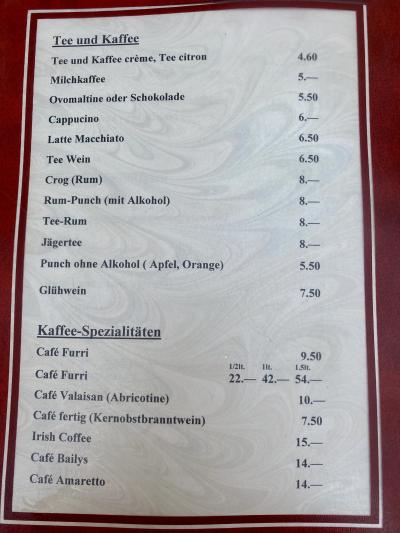 他にビール(2dl : 4CHF)、白ワイン(4.9)、ミネラル小(7)、トータル47.6CHF=約7,000円はツェルマットの平均的2人分ランチの費用かな。
