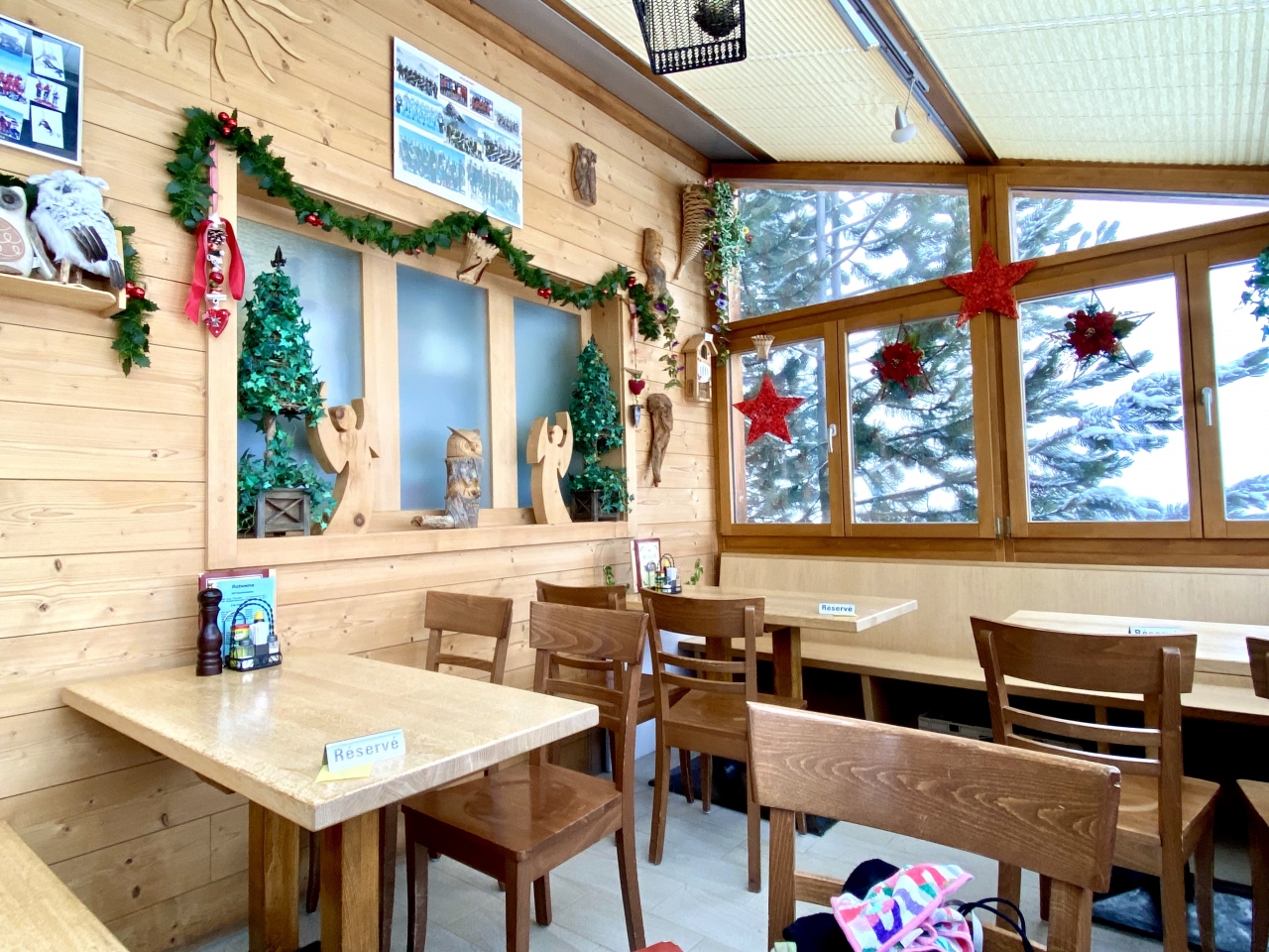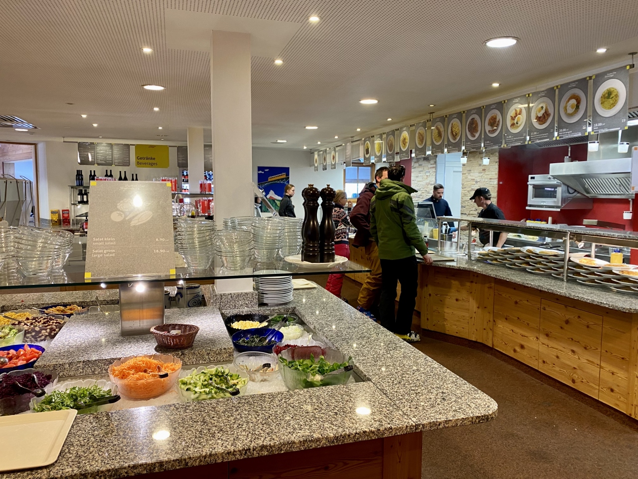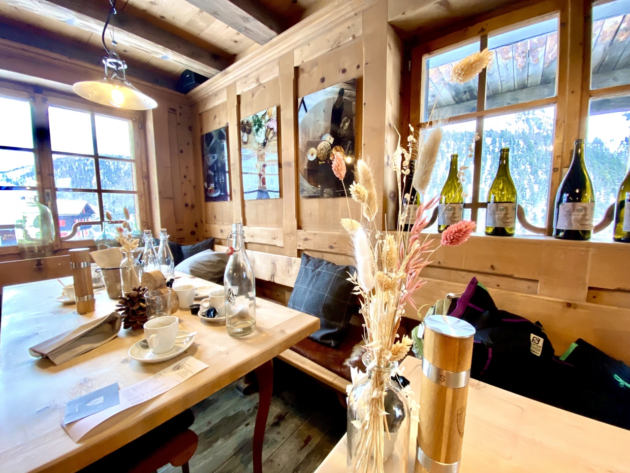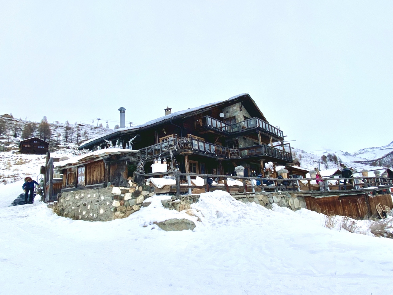 2018年夏、2020年2月に続いてランチタイム3回目の利用でした。いつも混んでいるので、今回は当日朝に予約をしてから行きました。曇天だったのでスキーはせず、ツェルマットからツムート経由で雪道を歩いて約2時間かけて向かいました。フーリのゴンドラ駅からなら徒歩1分の近さです。スタッフはいつも陽気であたたかく迎えてくれます。