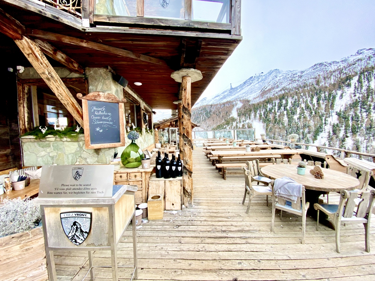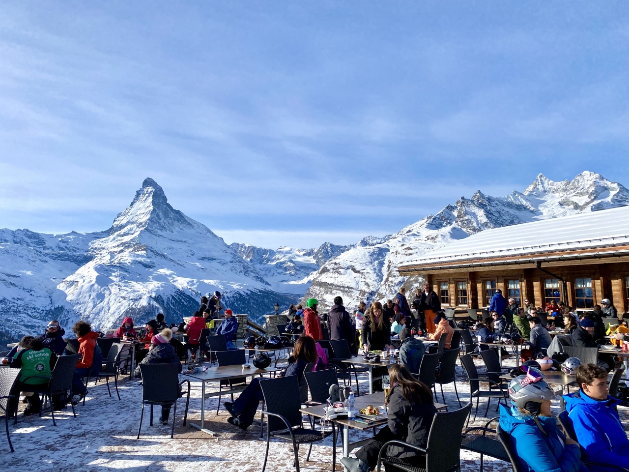今回でスイスは27回目、ツェルマットは16回目、そのうちスキーでは13回目となりました。夏・冬ともに色々なところでランチをいただきました。もしツェルマットでの滞在時間が短い場合でお天気なら、ひとつだけ訪れるべきはこちらのレストランのテラス席でしょう。