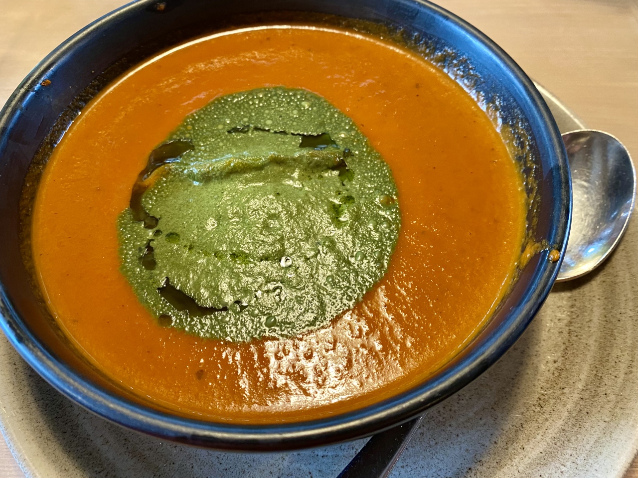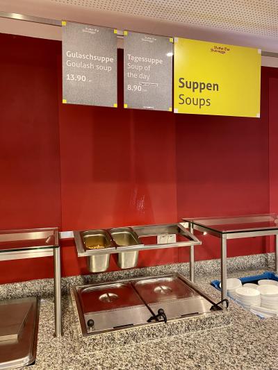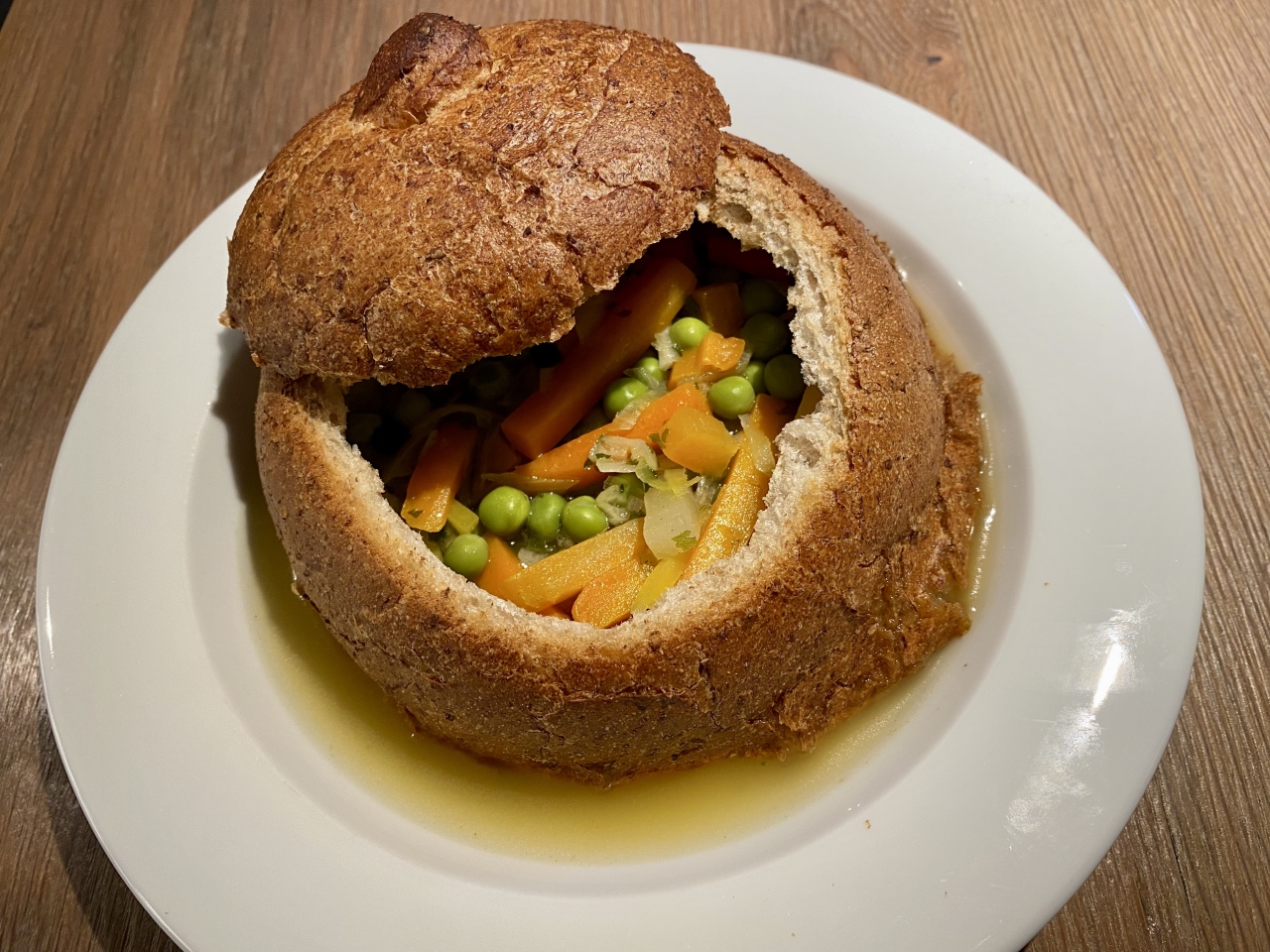 一番好きだったのは、パンをくりぬいた中に入っている濃厚なトマトスープでしたが、今回は大麦スープとともにメニューからなくなっておりショックでした。代わりに野菜スープ(11CHF)をいただき、容器のパンも完食しました。他にはカリー・ココナッツスープ(11CHF)、ホワイトワインスープ(12CHF)がありました。