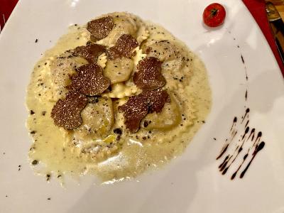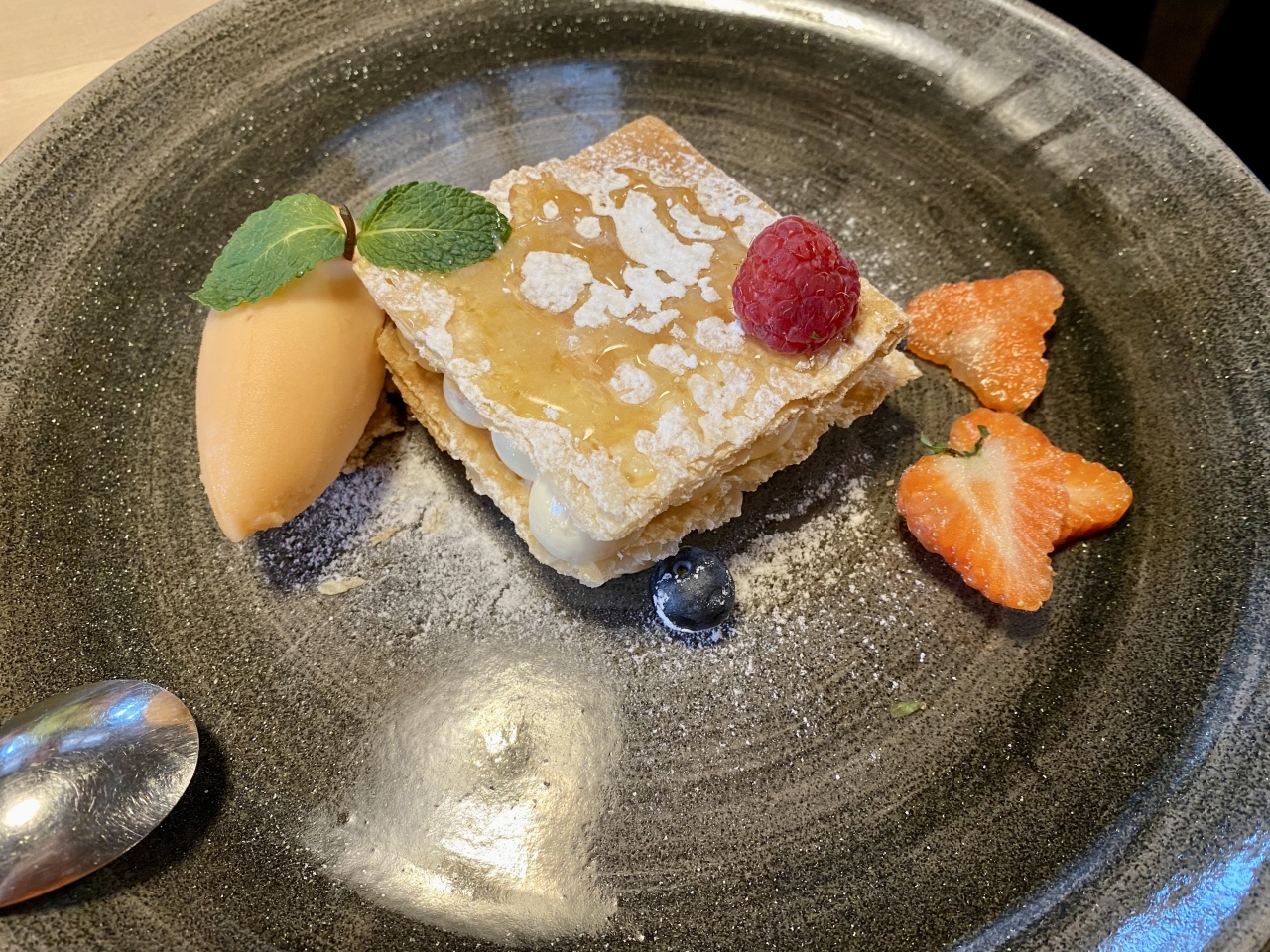 Agnolotti という手作りパスタ(42CHF)。黒トリュフが乗っており、クリームソースもめっちゃ美味し買ったです。アボガドムースの下にサーモンがあるサーモンタルト(28CHF)も、レモンをかけてケッパーなどと一緒にいただくと美味しかったです。パンナコッタ(14CHF)も普通に美味しいです。この店でまずいものを食べたことはありません。