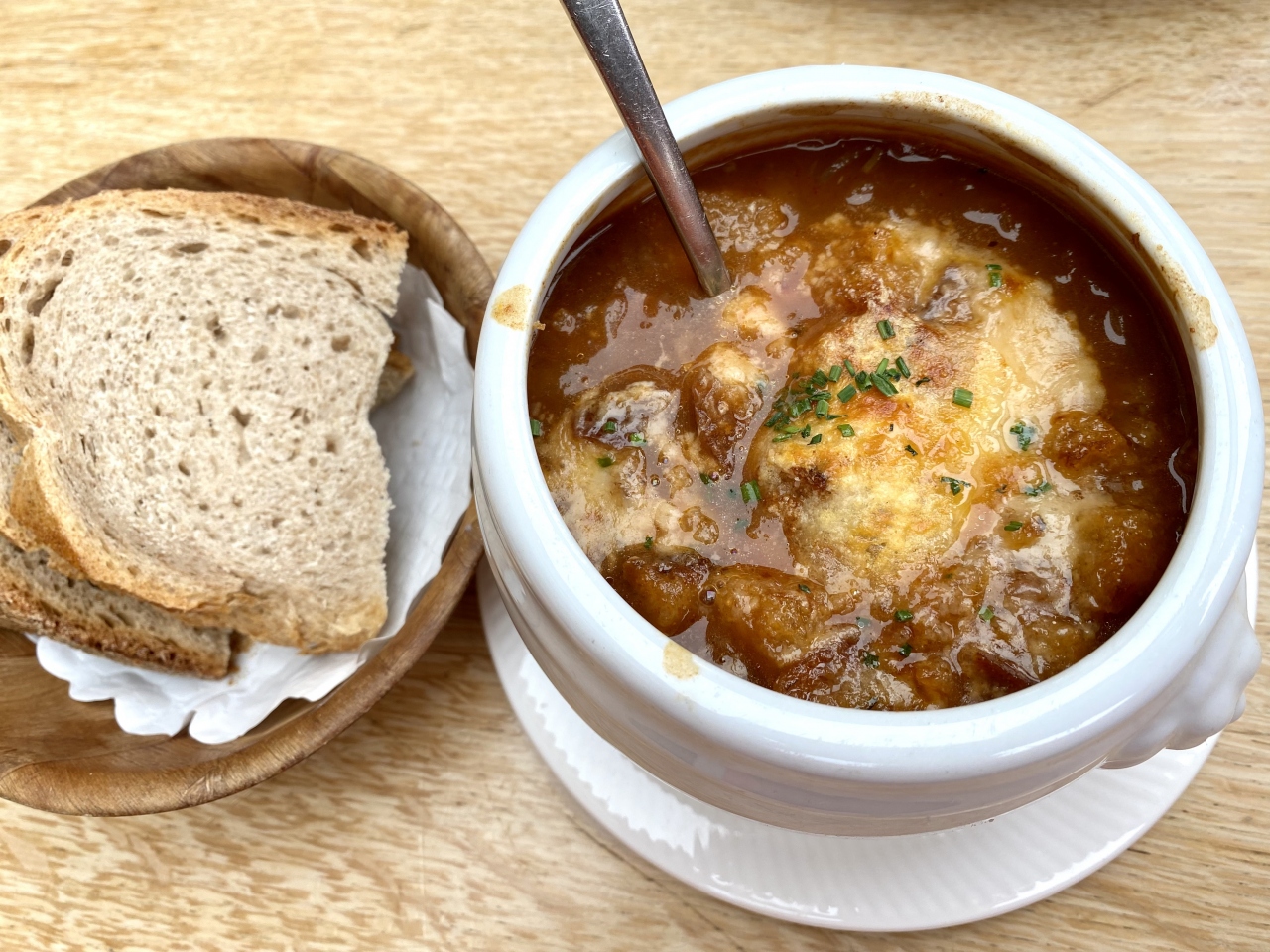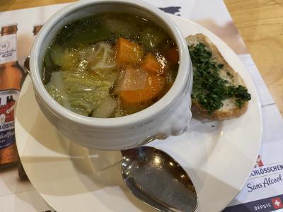 3回ともここではグレイテッド・オニオンスープ(12CHF)をいただきました。コロナ禍でも2020年と値段が変わっていませんでした。熱いですが、ふーふー言いながら美味しくいただきました。