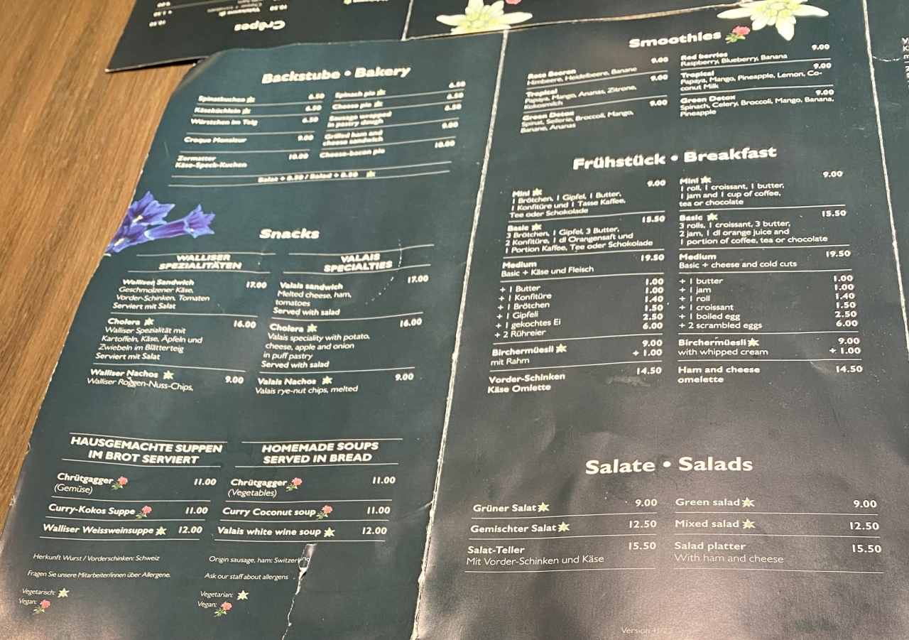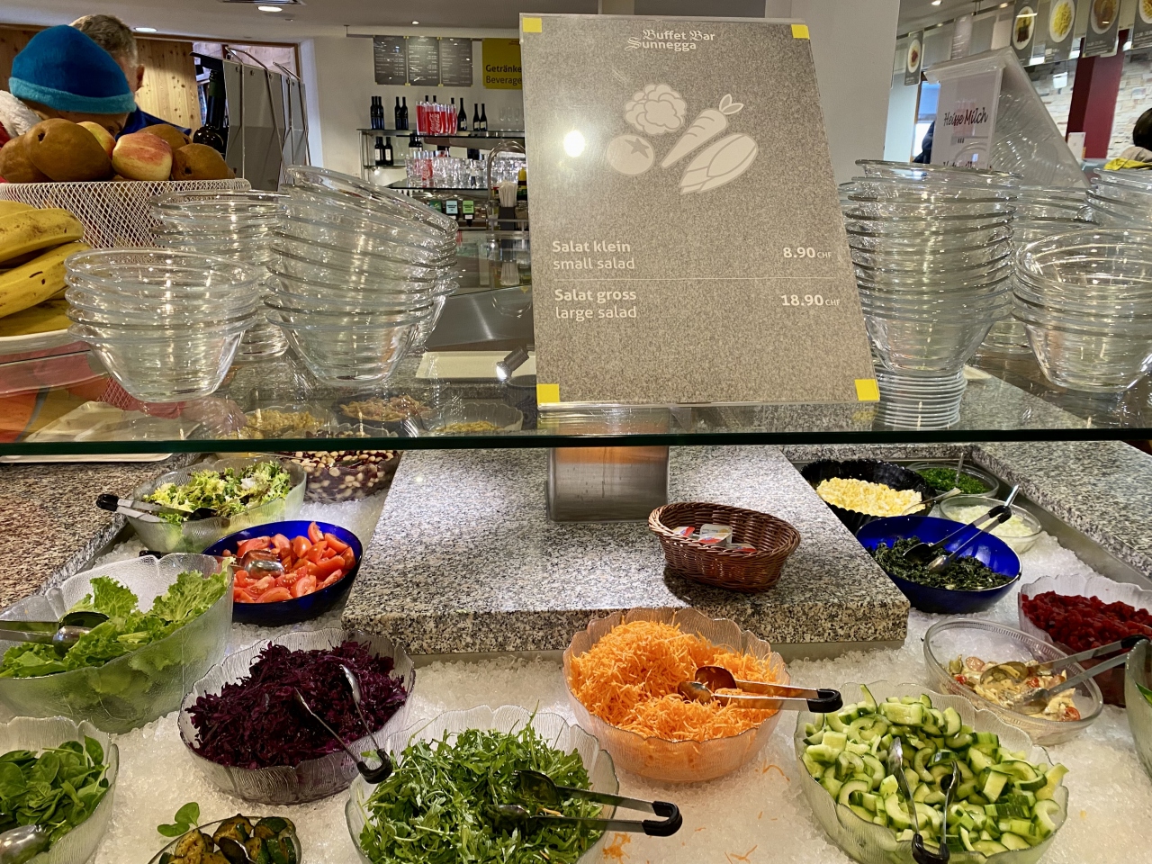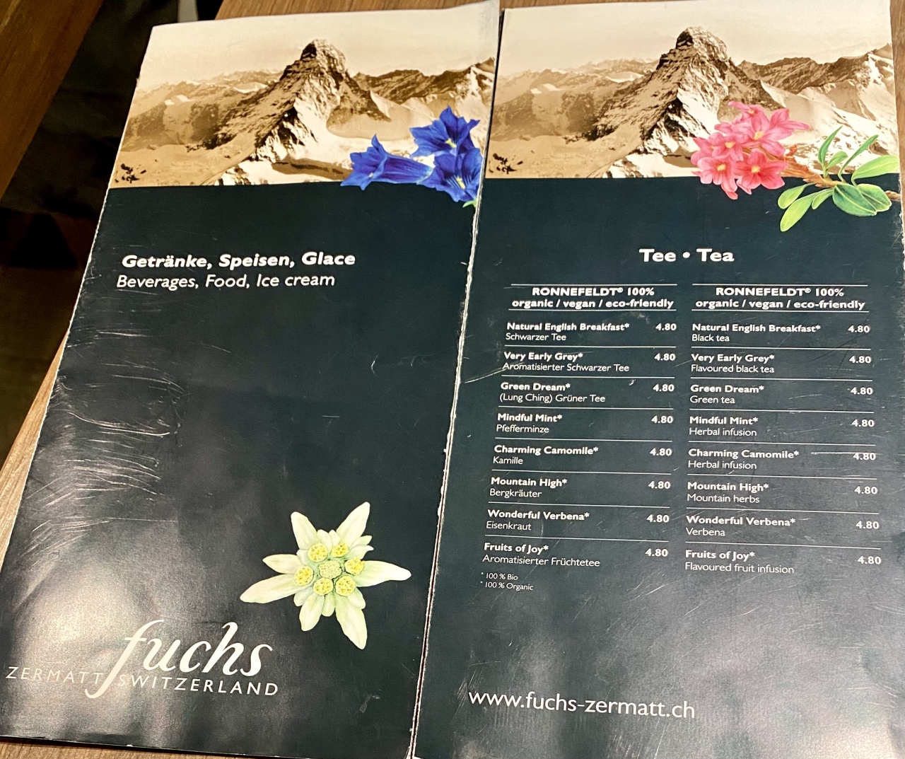 料理はブッフェ形式のところは、それほど美味しい物は期待できませんが、以前よりはツェルマット全体の食のレベルは向上してきたと感じます。ただし物価高のスイスにあって円安なので、かなり割高感はありますが、山岳リゾートは何かと経費もかかるので仕方ないでしょうね。