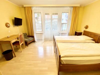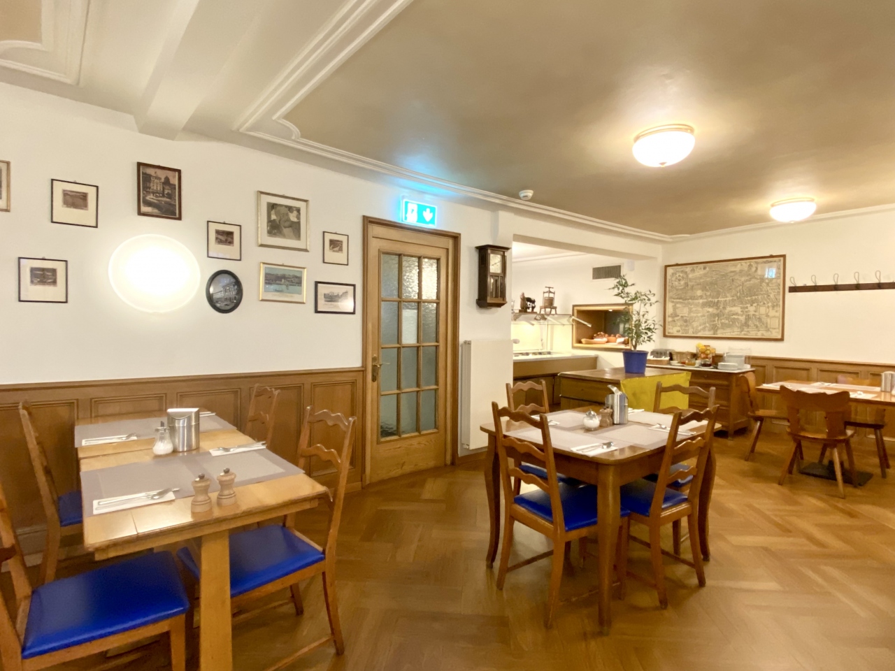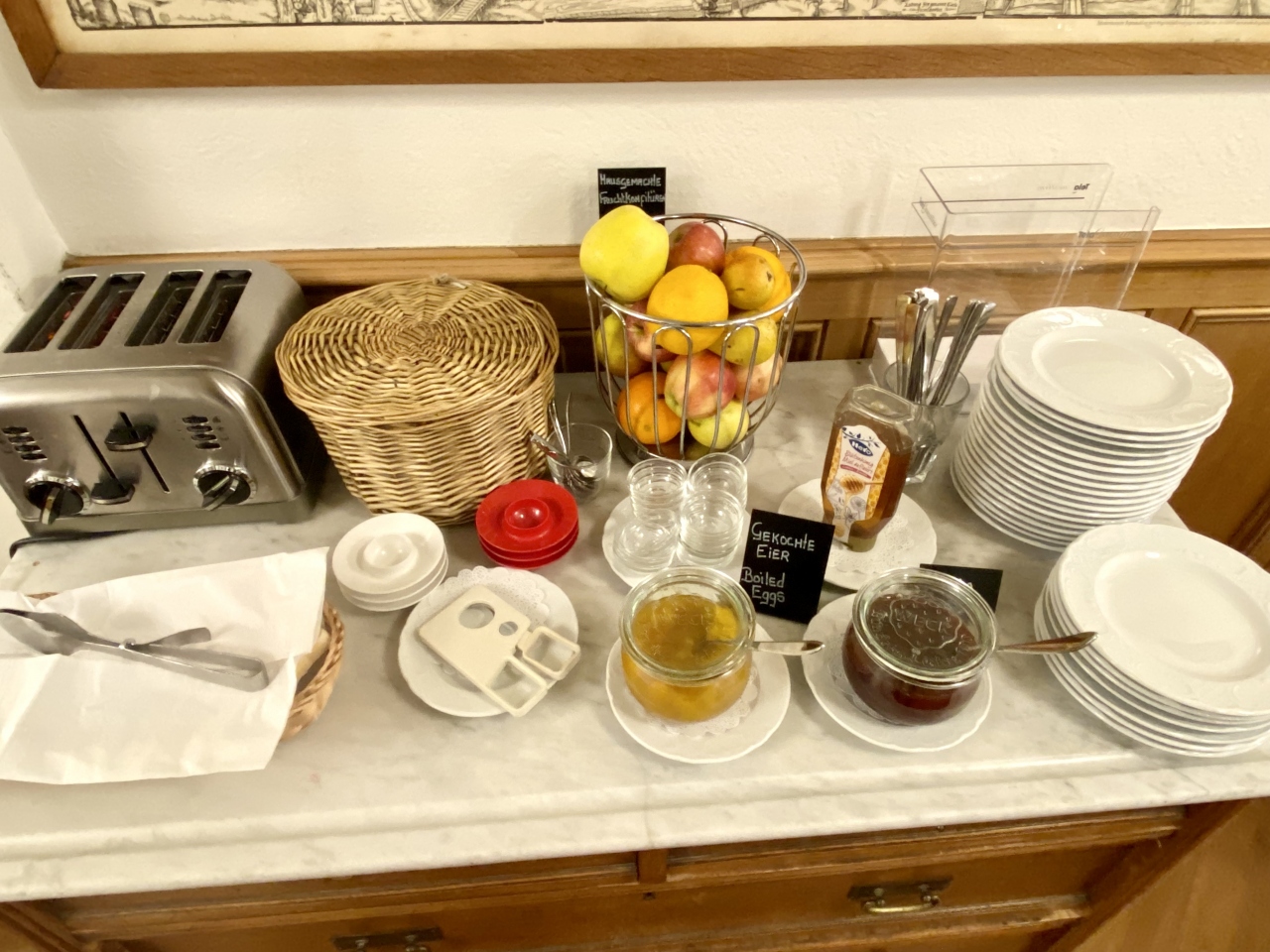 31号室の部屋はシングルベッド2台のツインルームでしたが、一人用ソファ椅子、木の机と椅子があり、クローゼットもありました。トイレとバスルームは別途にあり、バスタブもあって快適でした。シャンプーなどは備え付けのものはなく、1回分の使い捨てのものでした。バルコニーがあり、POLY BAHNのケーブルカーが見えていました。冷蔵庫はないので飲み物などをバルコニーに出して冷やしました。セイフティボックスはないので、パスポートなどはフロントの金庫を借りました。
