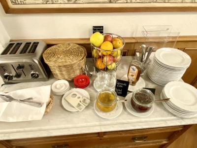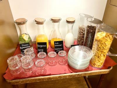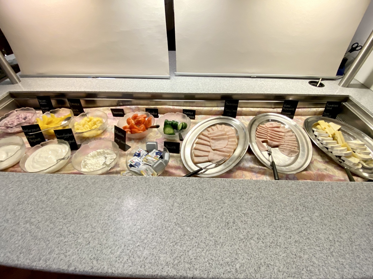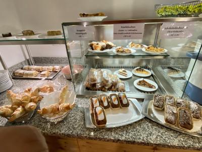 朝食なしのプランでしたが、最初の数回のみ別払いで食べました。ヨーグルト、ハム、チーズ、フルーツ、ゆで卵、パンがあったので十分でしたが、パンの種類は少なめでした。スタッフのおじさんはいつも歌をうたって陽気でした。