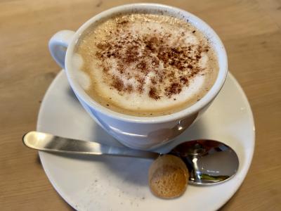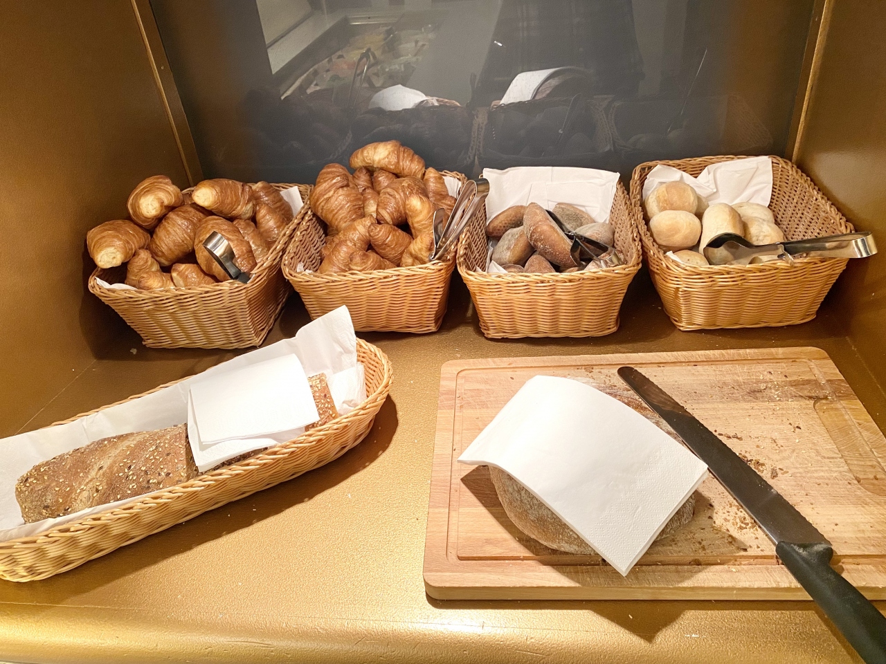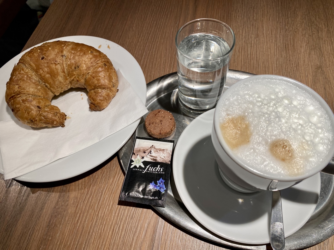 1階で買ったパンも2階で食べることができます。クロワッサン(1.9CHF)も美味しいです。カプチーノは4.7CHFでした。