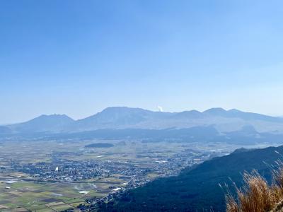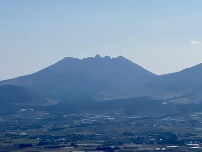 阿蘇五山は綺麗に横並びなので、一番左の根子岳を涅槃像の頭に見たて、涅槃像が仰向けに寝ている姿というのがよくわかりました。昔の人の想像力が素敵ですね。五山の手前に広がるカルデラの中に街があるというのは、世界的に見ても珍しいようです。右端、左端の段差を見ると、カルデラ大地の縁がよくわかります。