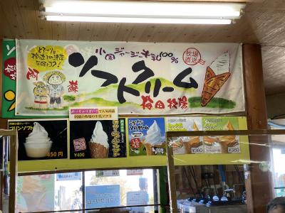 駐車場脇のお店にある小国ジャージー牛乳100%のソフトクリームが美味しかったです。