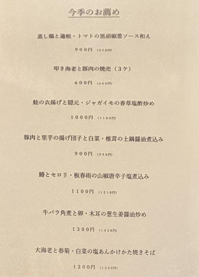 ドリンクは生ビール1つと、紹興酒の4年もの、8年ものを常温で1合頂きました。当然ながら8年ものの方がまろやかでした。日本酒も有名どころなどありましたが、中華料理にはやはり紹興酒が一番あうように思います。日本料理に日本酒が合うように。