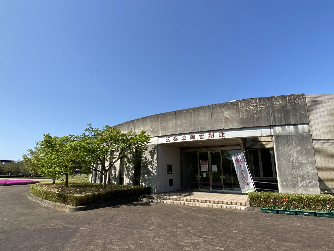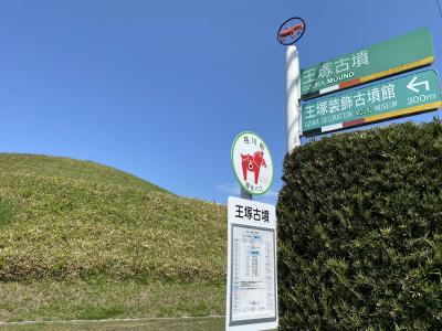 外に出て階段を登ると、発掘された前方後円墳があります。立派な入口がついており、観察室はこの内部です。中の様子や色使いがわかる説明板もありました。裏側を下までくだると、バス停がありました。