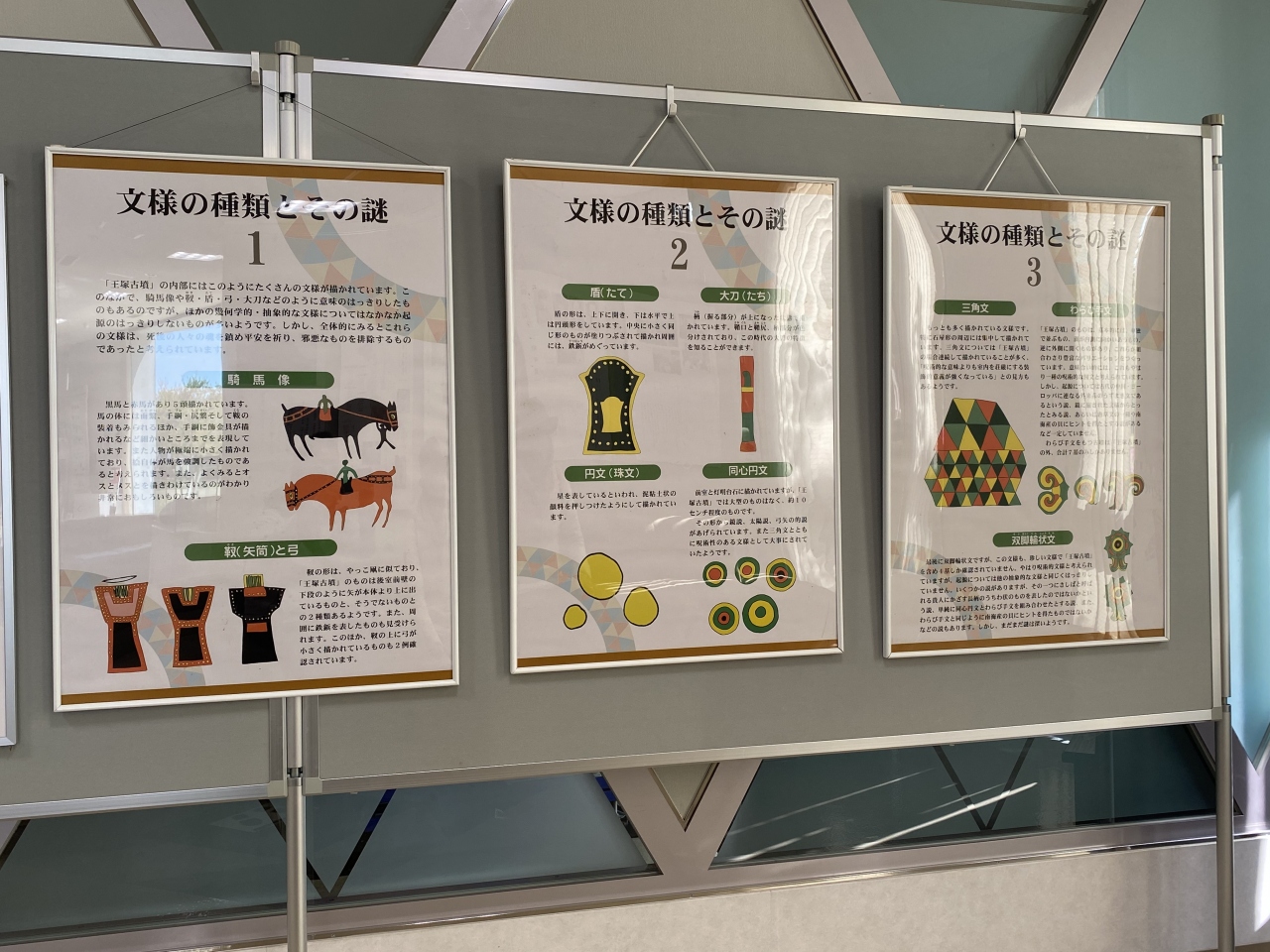 展示コーナーに戻ると、顔料やその原料の解説がありました。装飾古墳の文様の解説もありましたが、大陸で一般的な肖像画よりも、コチラのような幾何学文様の方がアート感が高いと、個人的には思いました。