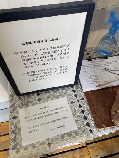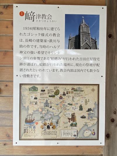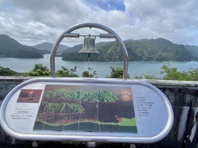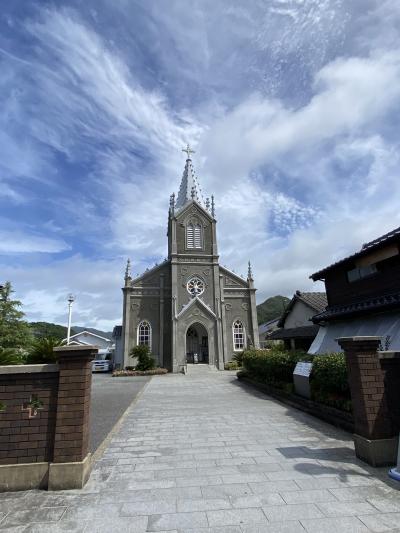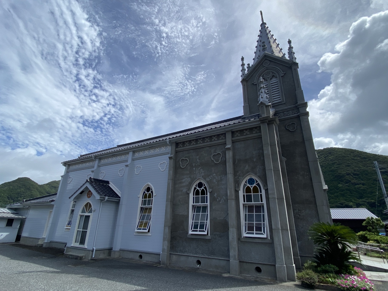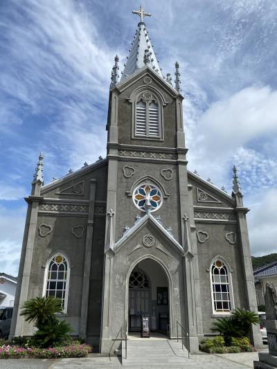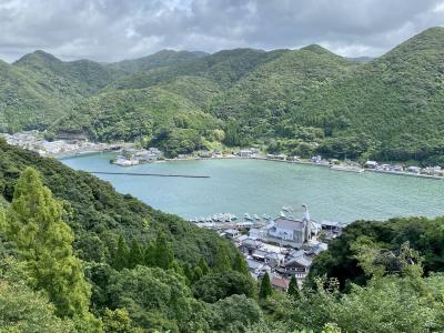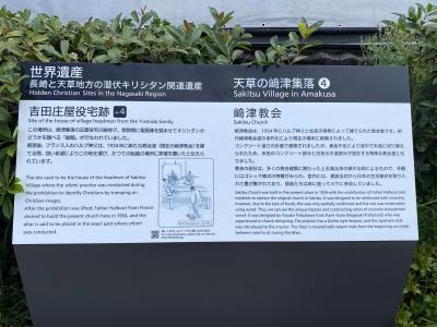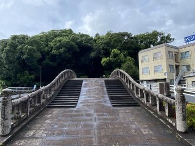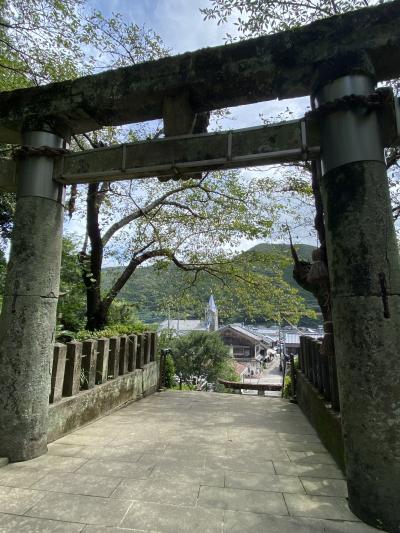 諏訪神社の横をさらに進み金毘羅宮への石段を登りました。下からトータル約500段。展望台は広く、冬場は夕陽が綺麗みたいですが、暑い夏ですのでここまで来ている人はゼロ。鐘がある方からは、山々と東シナ海が望めます。反対側にまわると、海に浮かぶかのような崎津教会と集落が見えました。