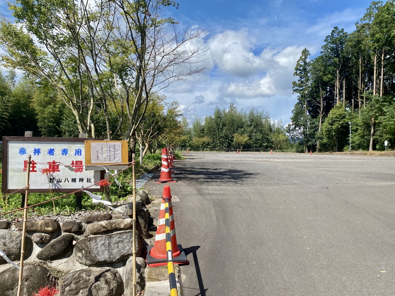 268号線にある案内板から坂を少し登ると駐車場。神社の規模の割には広めです。