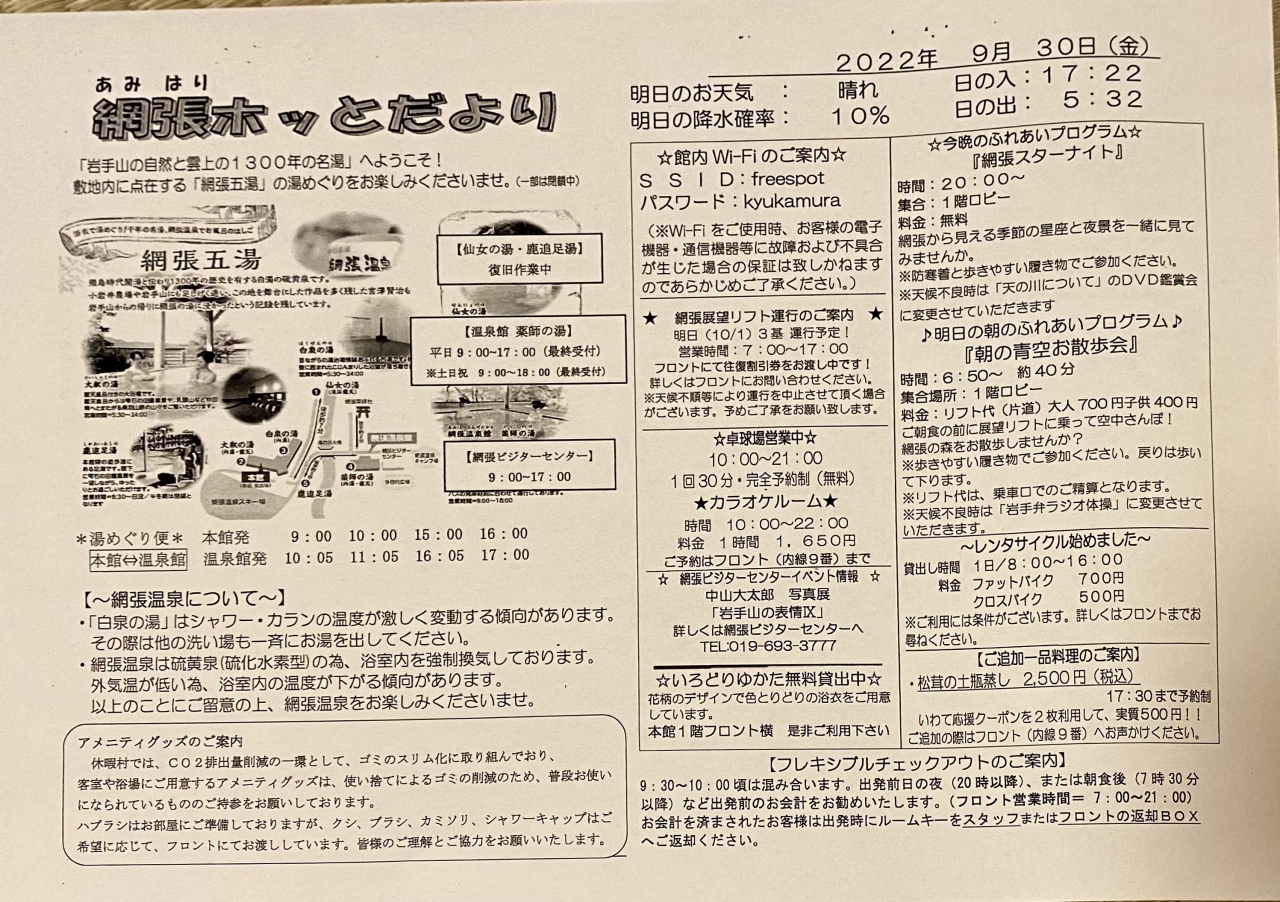 翌日に紅葉の栗駒山へ登るために前泊しました。玄関前に一旦車をとめて荷物をおろし、車をとめに行きましたが、暗くなってからの到着だったので、駐車場が真っ暗でわかりにくかったです。道中からあらかじめ電話して到着時刻を知らせておき、夕食時間も予約しておいたので、フロントでの対応はスムーズでした。