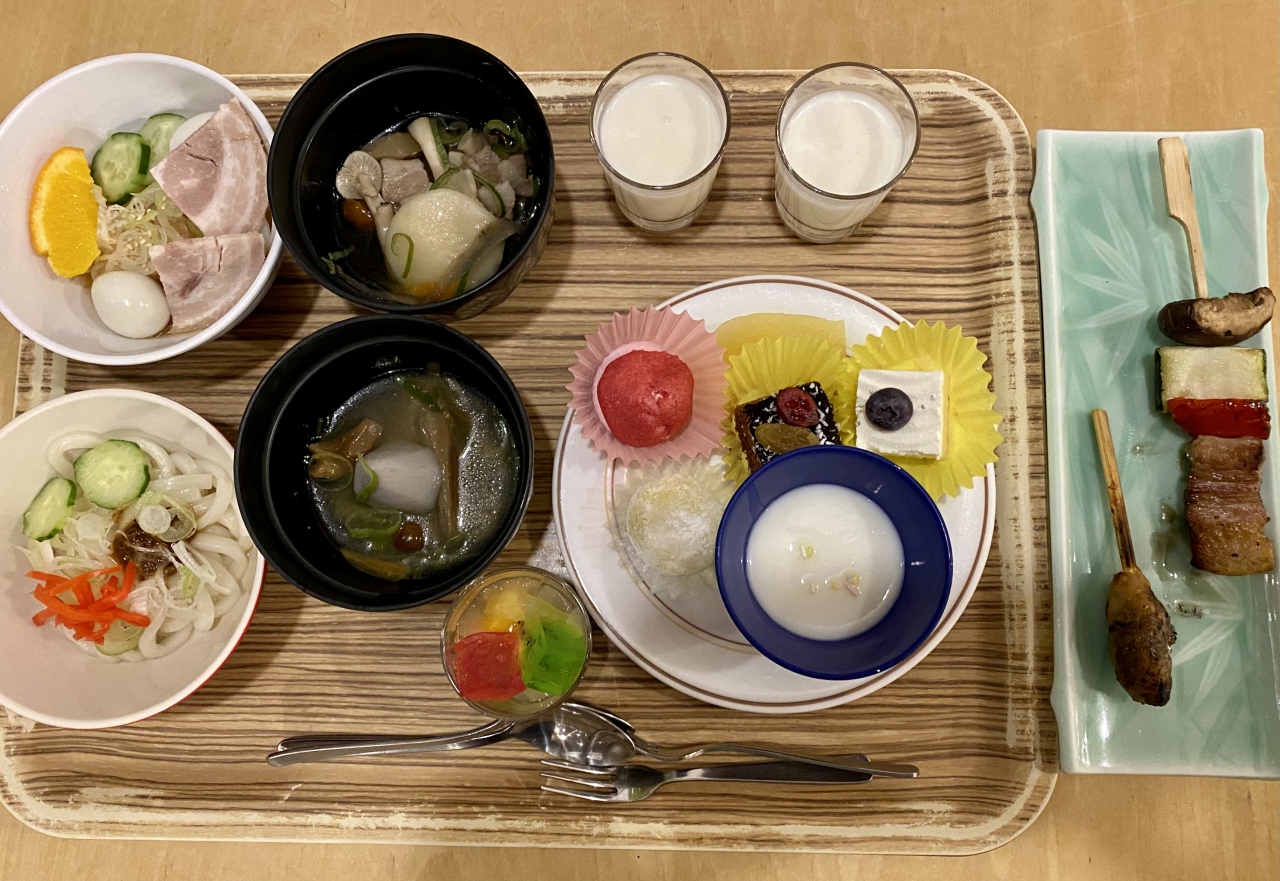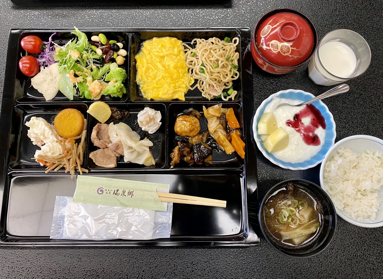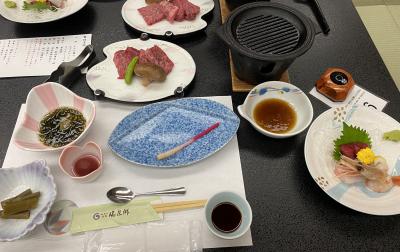 夕食はコースで、プラン料金によって若干品数が違うようでした。安いプランにしていましたが、前沢牛もあり、セルフコーナーには、白米(一関ひとめぼれ)、出汁茶漬け、しじみの味噌汁、おすすめの揚げ物、漬物各種、鶏そば、ひとくちケーキ、マンゴー、胡麻団子があり、十分満足でした。