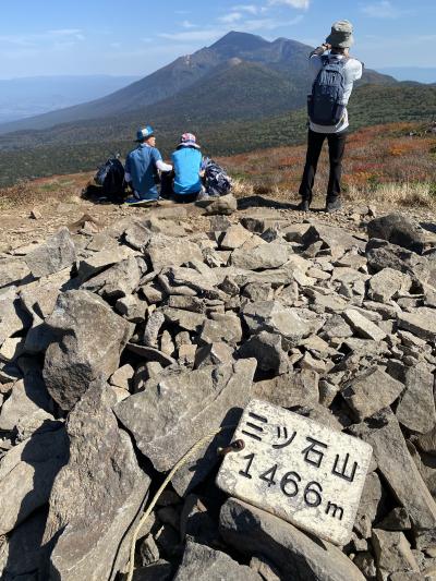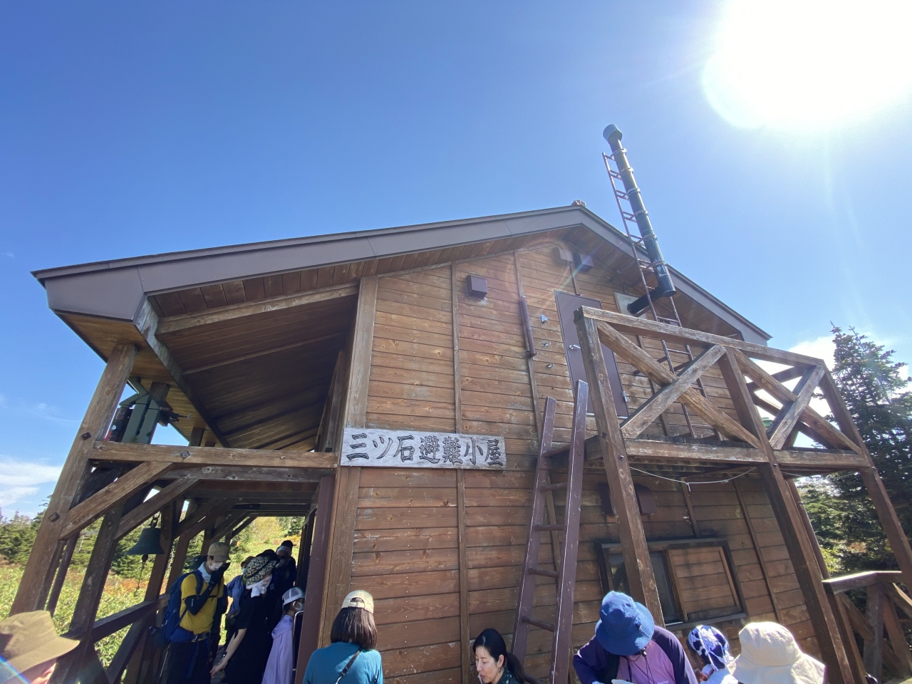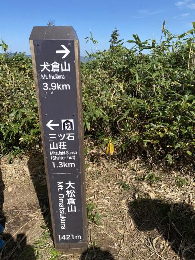 リフトを降りてからのルートでは分岐点で犬倉山には登らず、大松倉山を経由して気持ちの良い尾根沿いを歩き、三ツ石山避難小屋でトイレ休憩(15分並びました)を経て、三ツ石山山頂へ。64歳、63歳の夫婦二人とも、スタートから休憩トイレタイムを入れて約3時間かかりました。